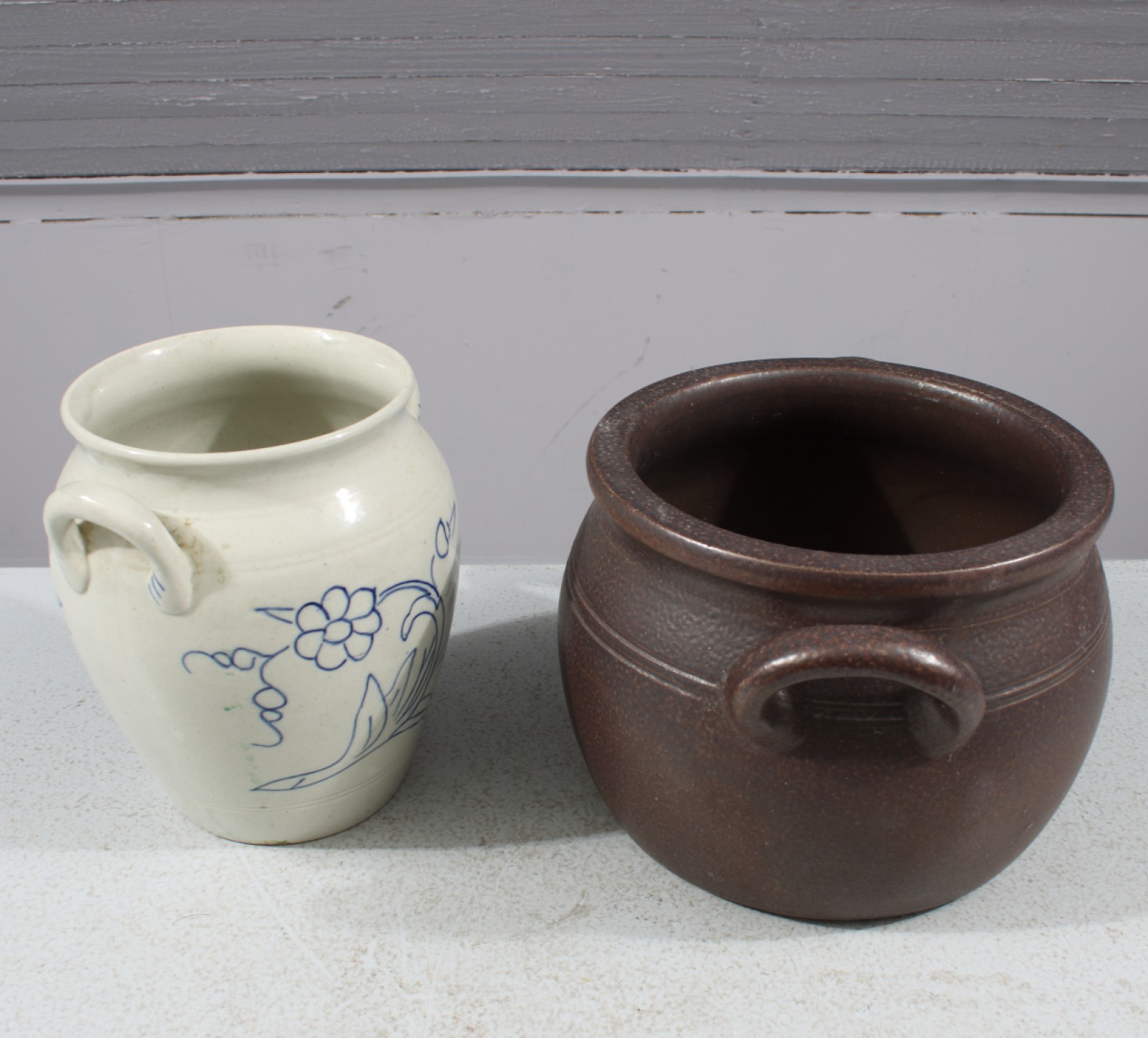 2 stycken, stengods, 1st blåvit "Göteborg" samt 1st 5 lit "Höganäs", höjd 17,5-20 cm. (vån3)