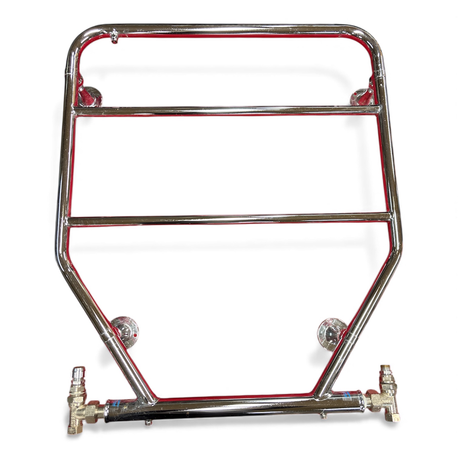 Kromad handdukstork för badrum, tillverkad av SOMA THERM, Arvika. Avsedd för vattenburen anslutning (rörkopplingar sitter monterade enligt bild).