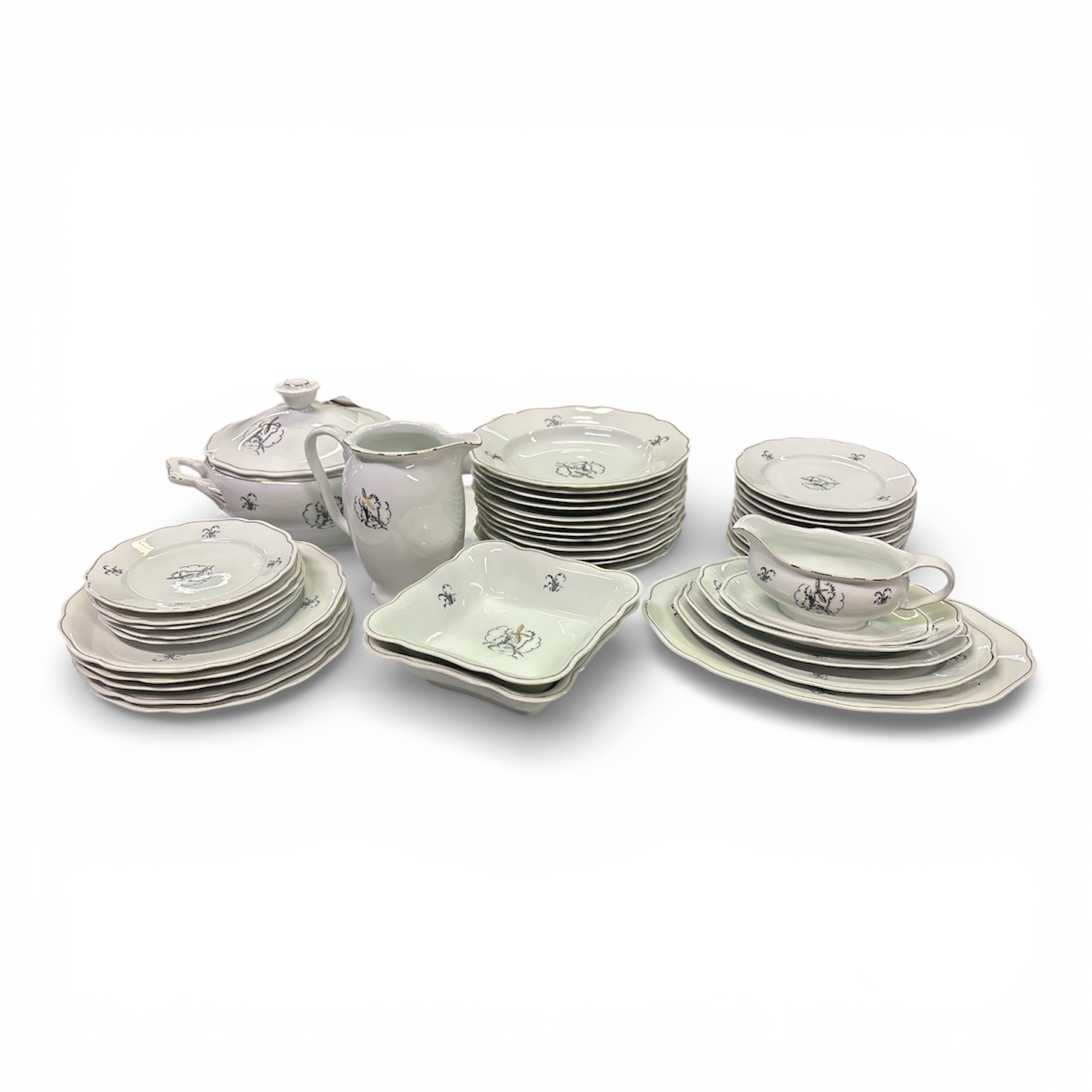 Äldre porslinsservis – vit med svart/gulddetaljer