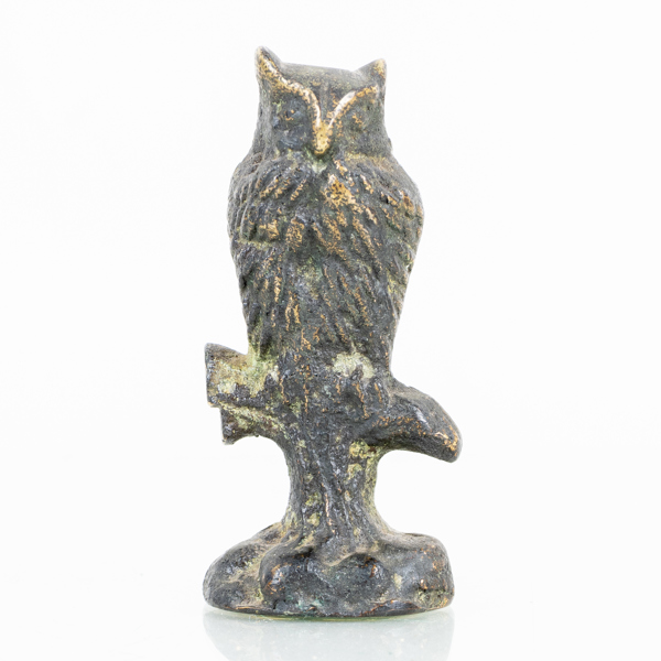 Uggla på gren, med bokstäverna WG, höjd ca 7 cm
