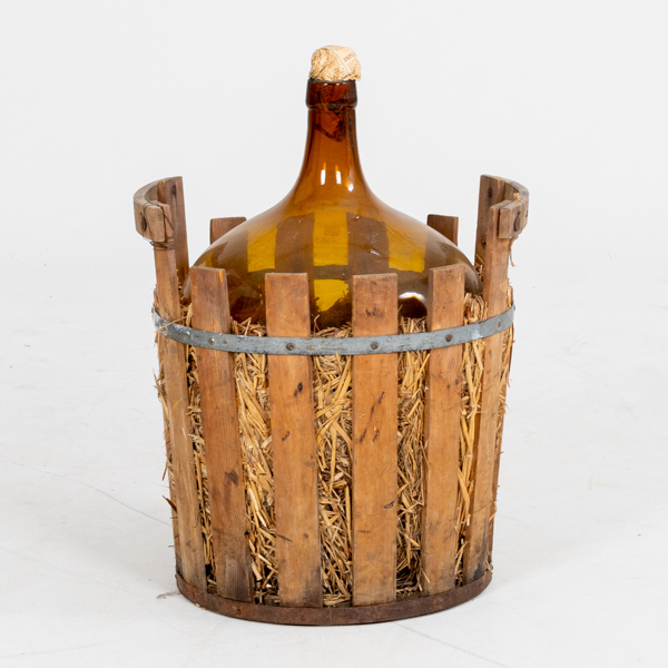 Bruntonat glas, i trä korg, höjd ca 57 cm