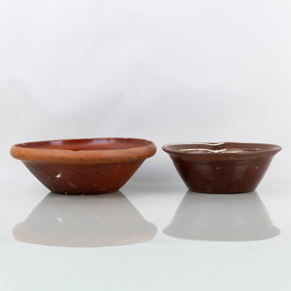 Brun glasyr, den mindre med randdekor, diameter ca 23 - 28 cm