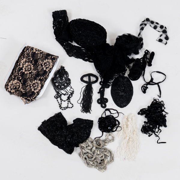 Bla band, toffsar och dekorationer, några med pärlor och paljetter