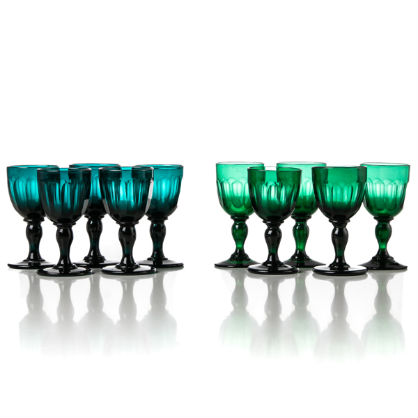 VINGLAS, 10 st, 1900-tal, slipad dekor, gröntonat glas (5 ljusa, 5 mörka).