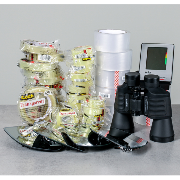 Tejp, backspeglar, blodtrycksmätare, kikare