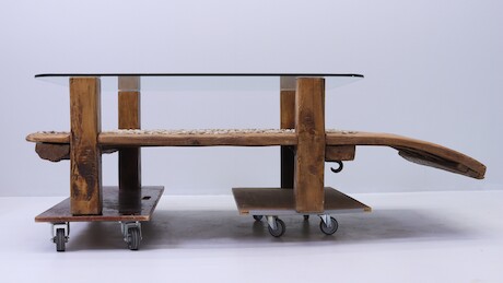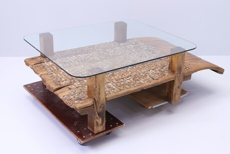 Bilder Soffbord med glasskiva, tillverkat av delar från slåtterbräda/tröskbräda, 1800-tal, H=50 L=170 B=103