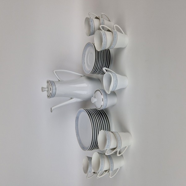 Kaffekanna, höjd 26 cmSockerskål med lock, höjd 9,5 cmGräddkanna, höjd 8 cmKaffekopp, 10 st, höjd 7 cmKaffefat, 11 st, diameter 12,5 cmAssiett, 11 st, diameter 17,5 cm