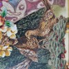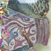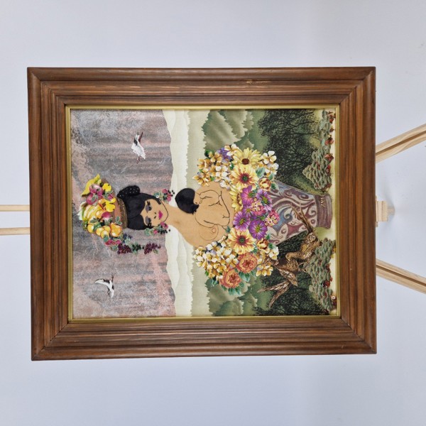 Komposition med textil, pärlor och stenar. "Dam med frukt". Signerad "Ani".