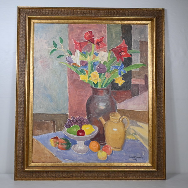 Ellis Walin, "Stilleben med gul kruka", olja på duk, signerad.