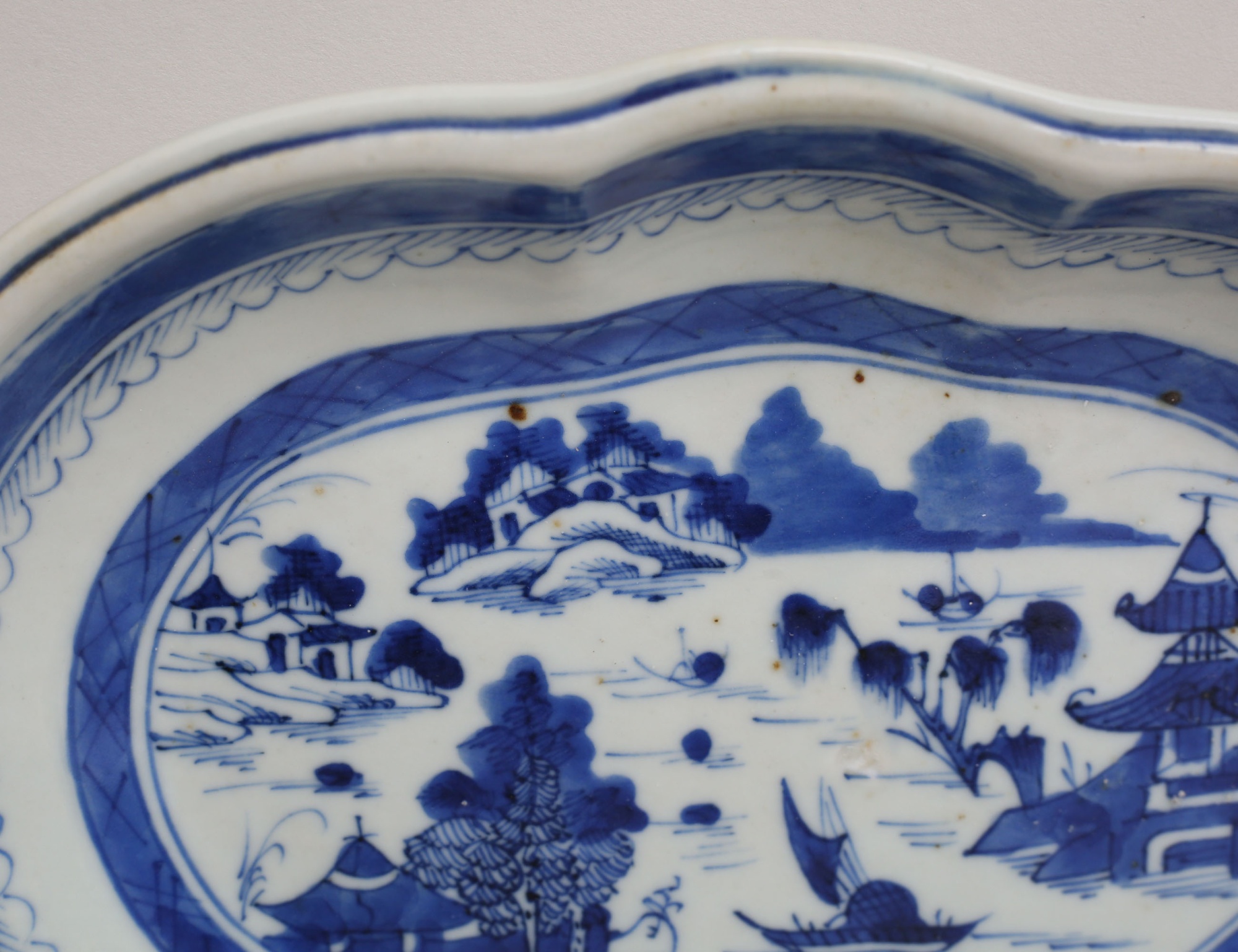 blåvit underglasyrdekor, motiv av sjölandskap, 26x21 (smärre tillverkningsdefekter)
