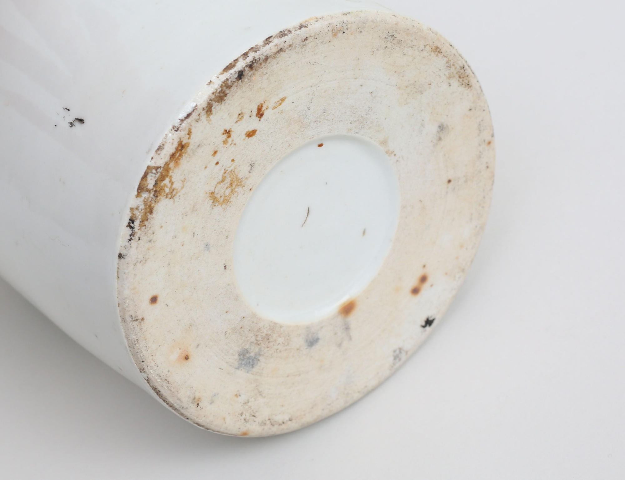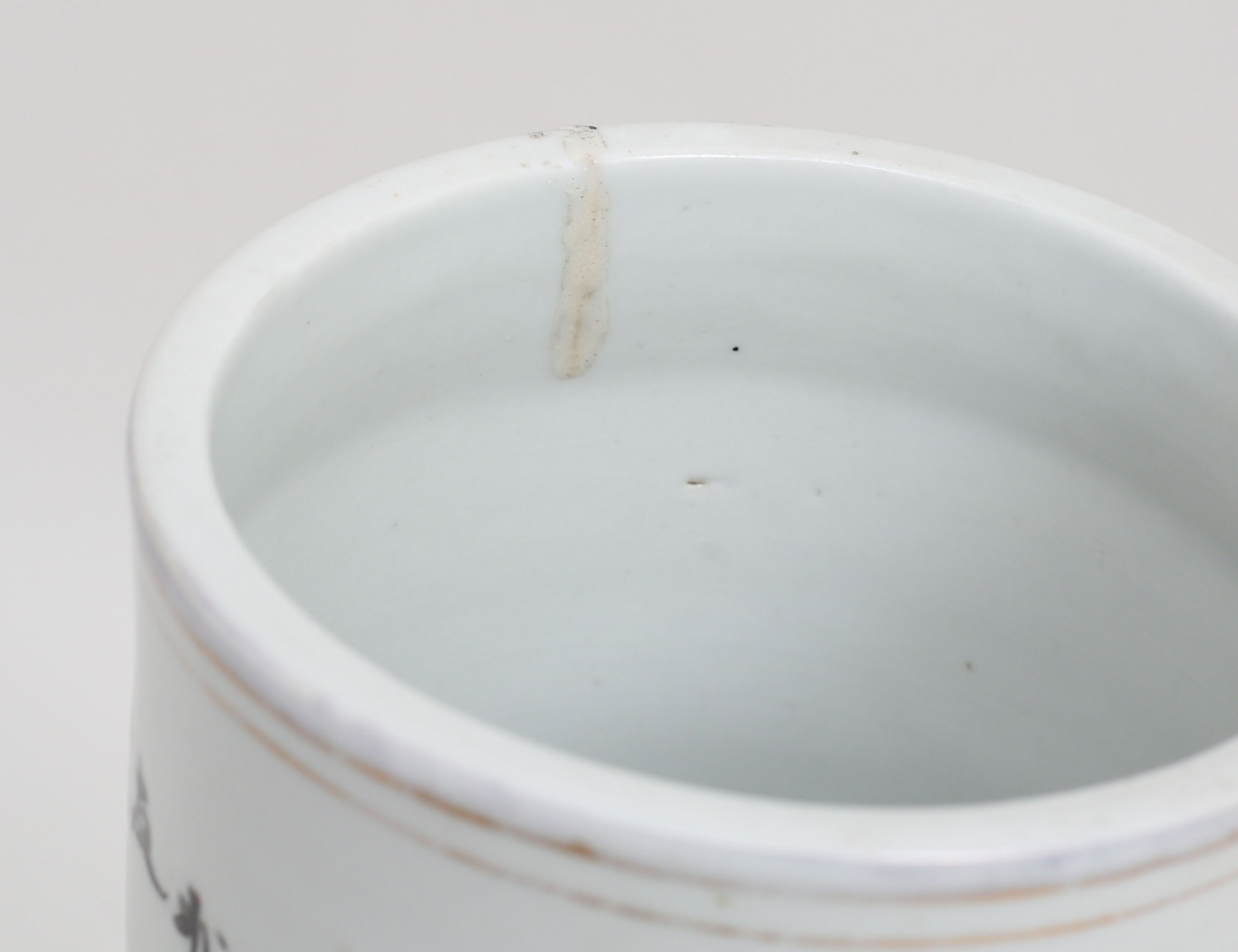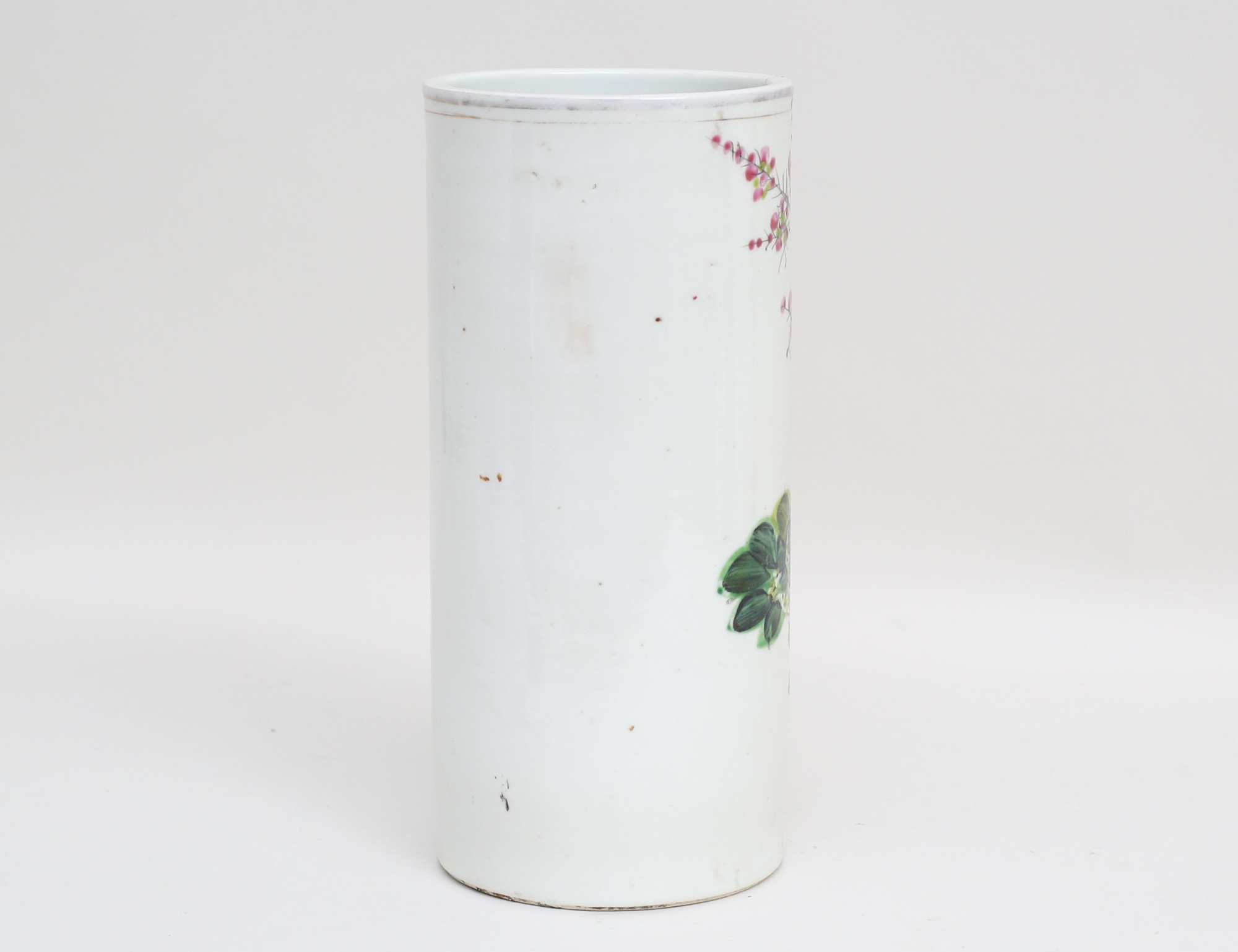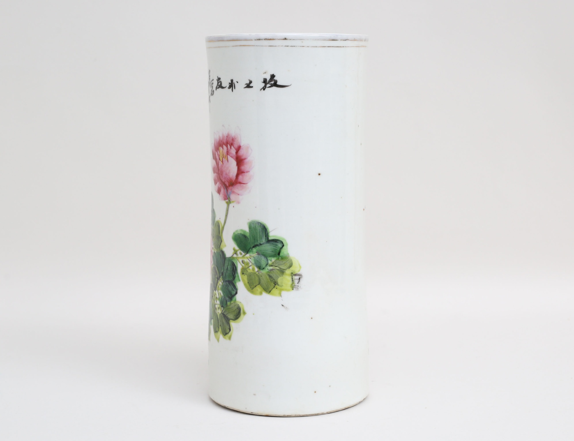 polykrom dekor, motiv av fågel och pioner samt skrivtecken, höjd 27,5 (tillverkningsdefekt)
