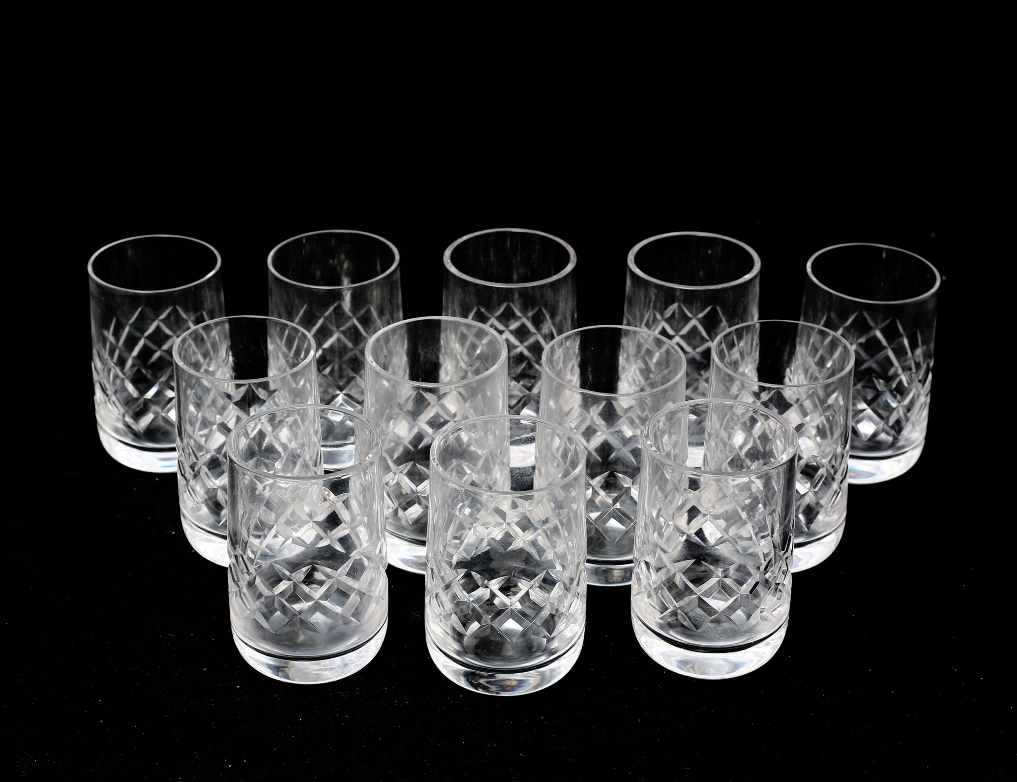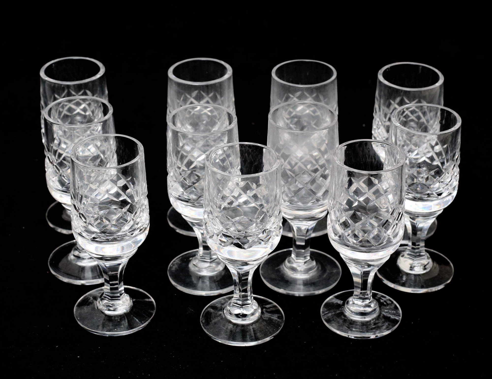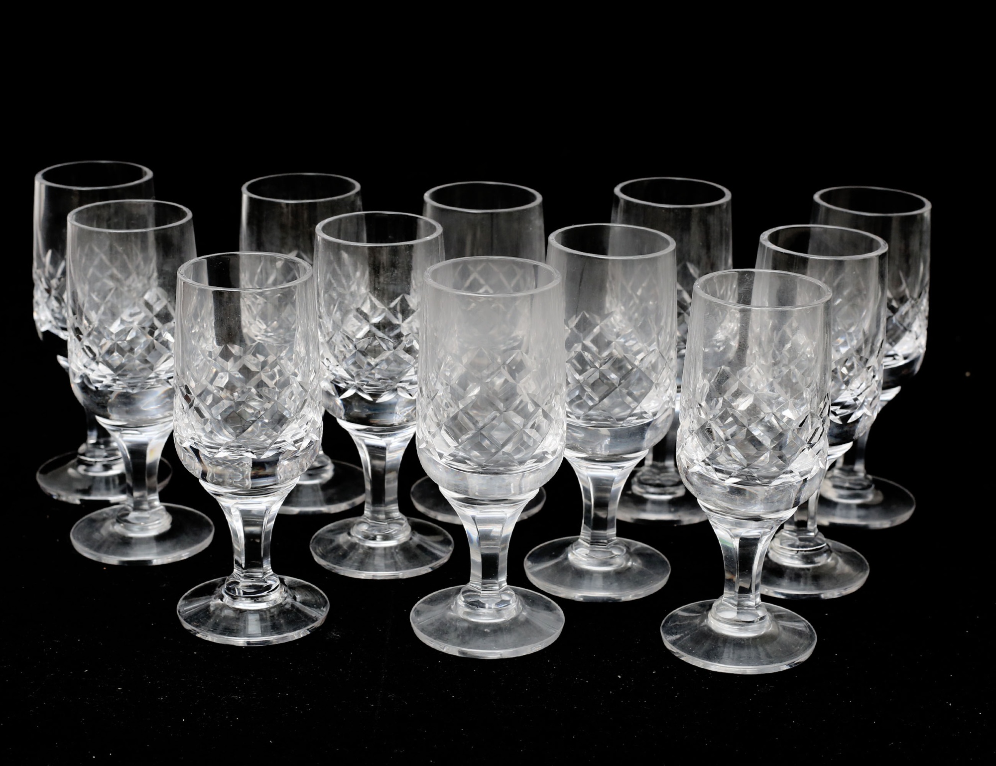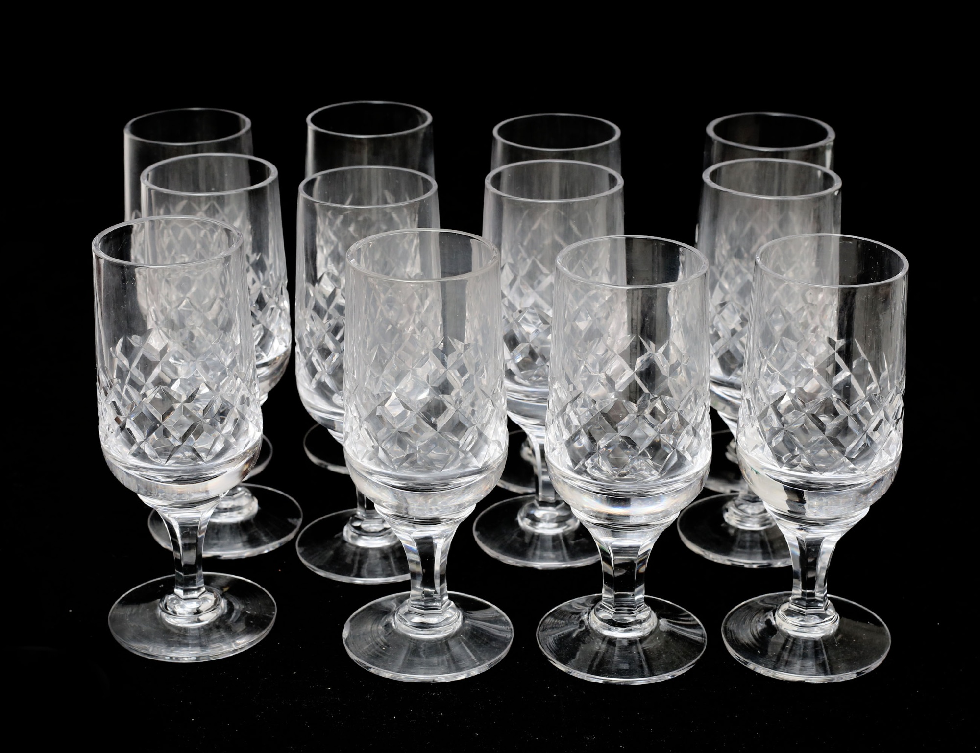10+12 vinglas, 4 grogglas, 12 starkvin, 11 snaps, 12 selterglas, rutslipad kristall, höjd 8,5-17,5