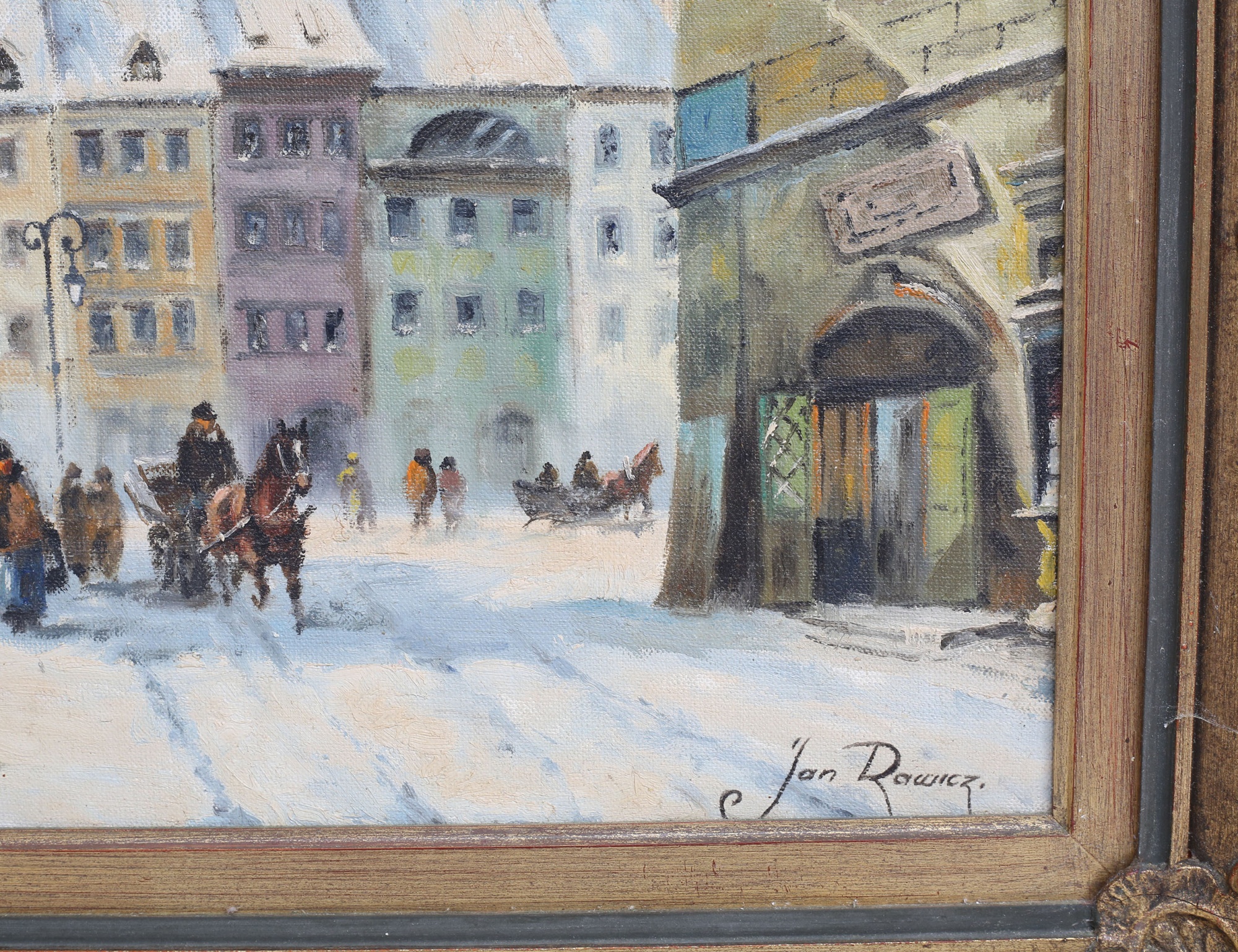 oljemålning på duk, vinterstad med hästar och figurer - Warzawa (?), signerad, 35x50, rammått 48x63