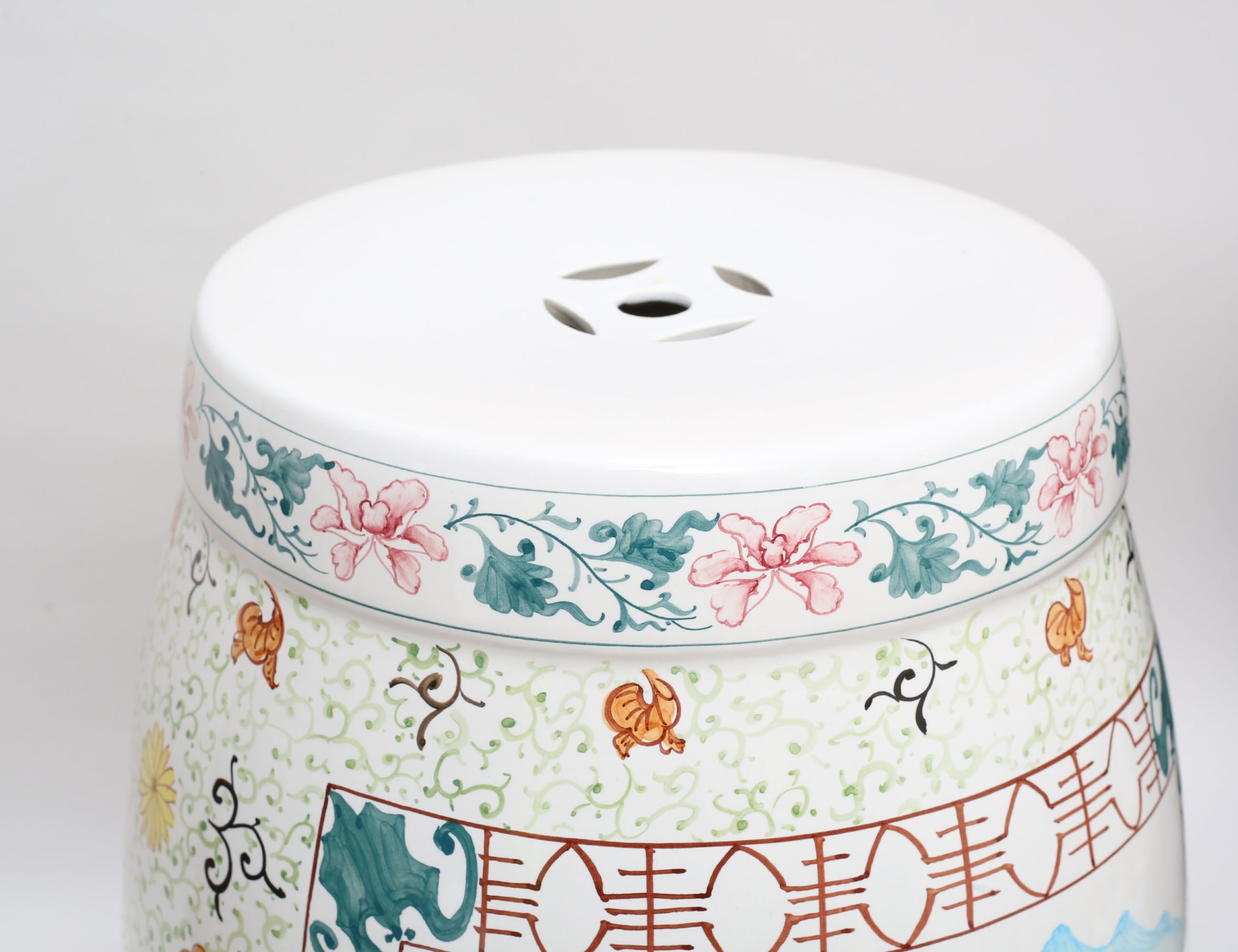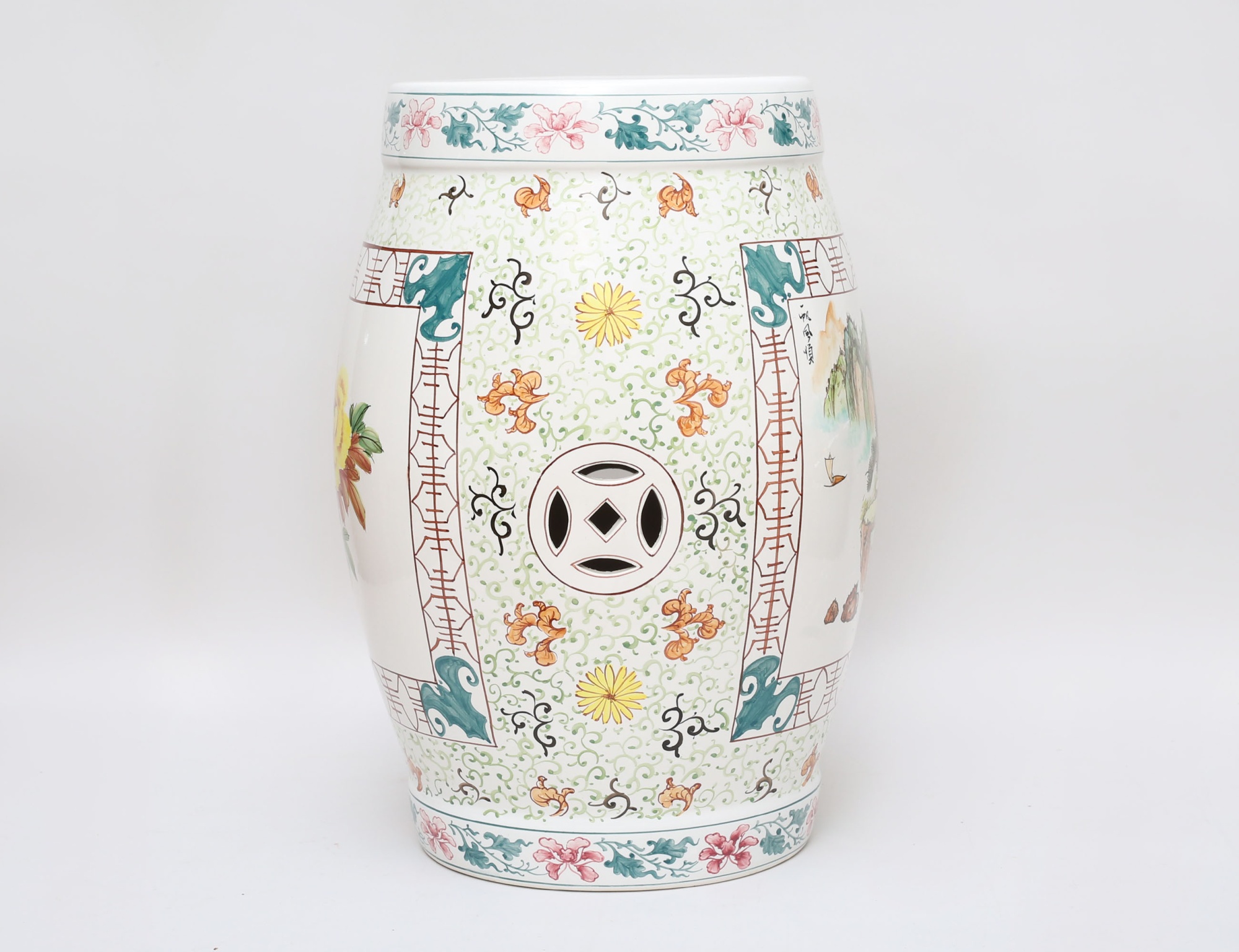 porslin, polykrom dekor samt skrivtecken, delvis genombruten, höjd 48, diameter 26