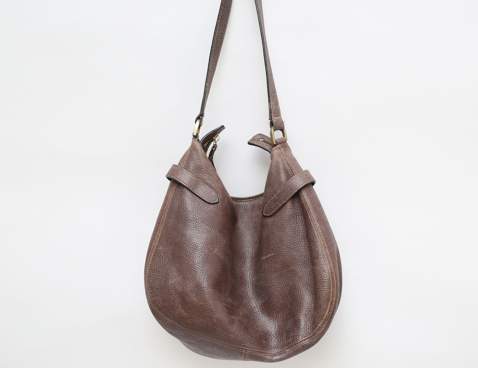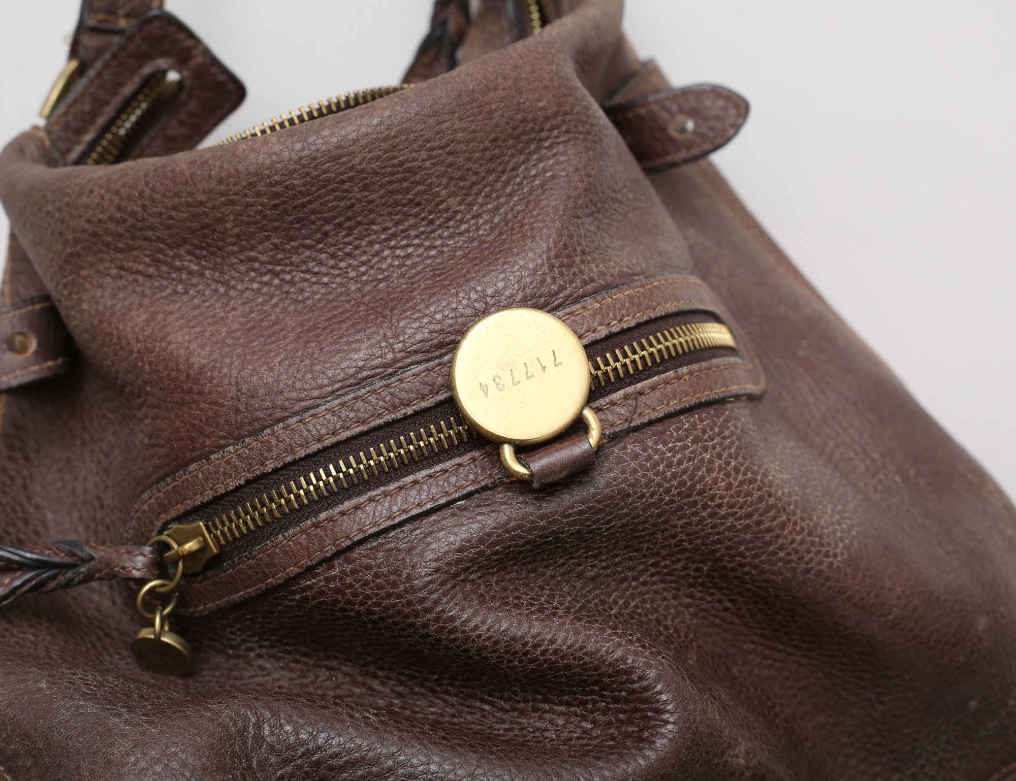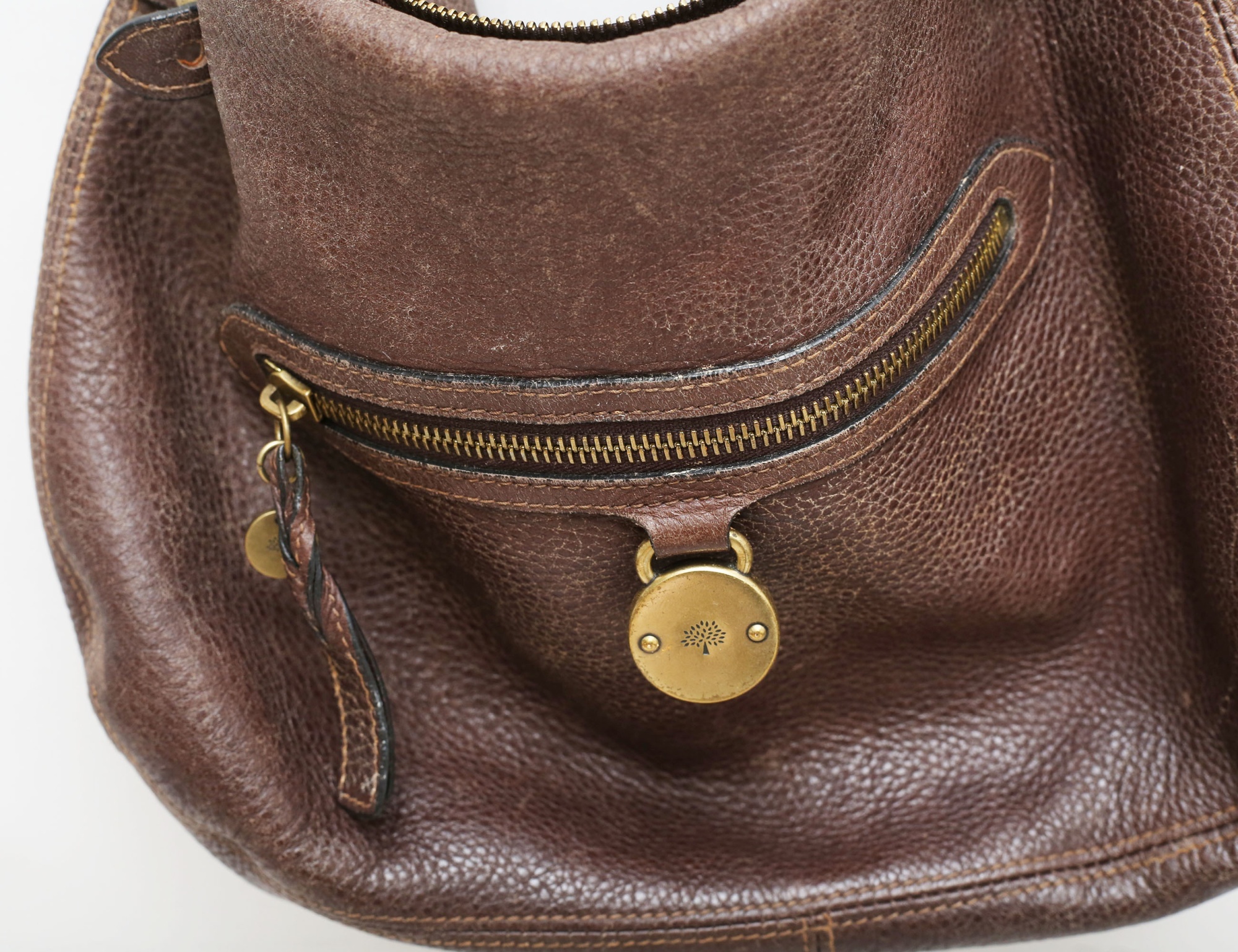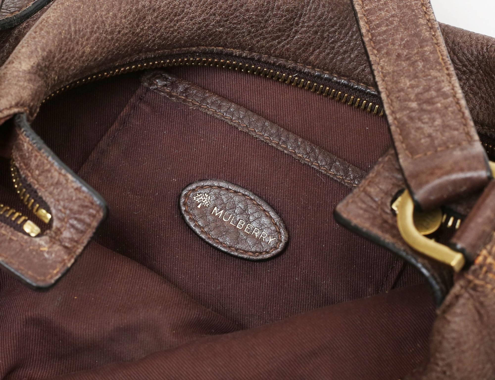 mullvadsfärgat mjukt läder, invändigt tre fack varav ett med dragkedja, utvändigt fack med dragkedja, mässingsfärgade detaljer, märkt Mulberry samt numrerad mässingsplakett, höjd 23, bredd 32 (bruksslitage)