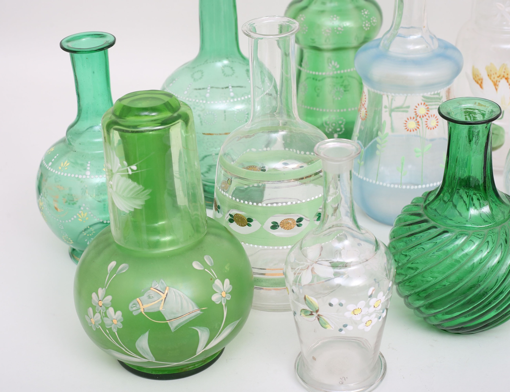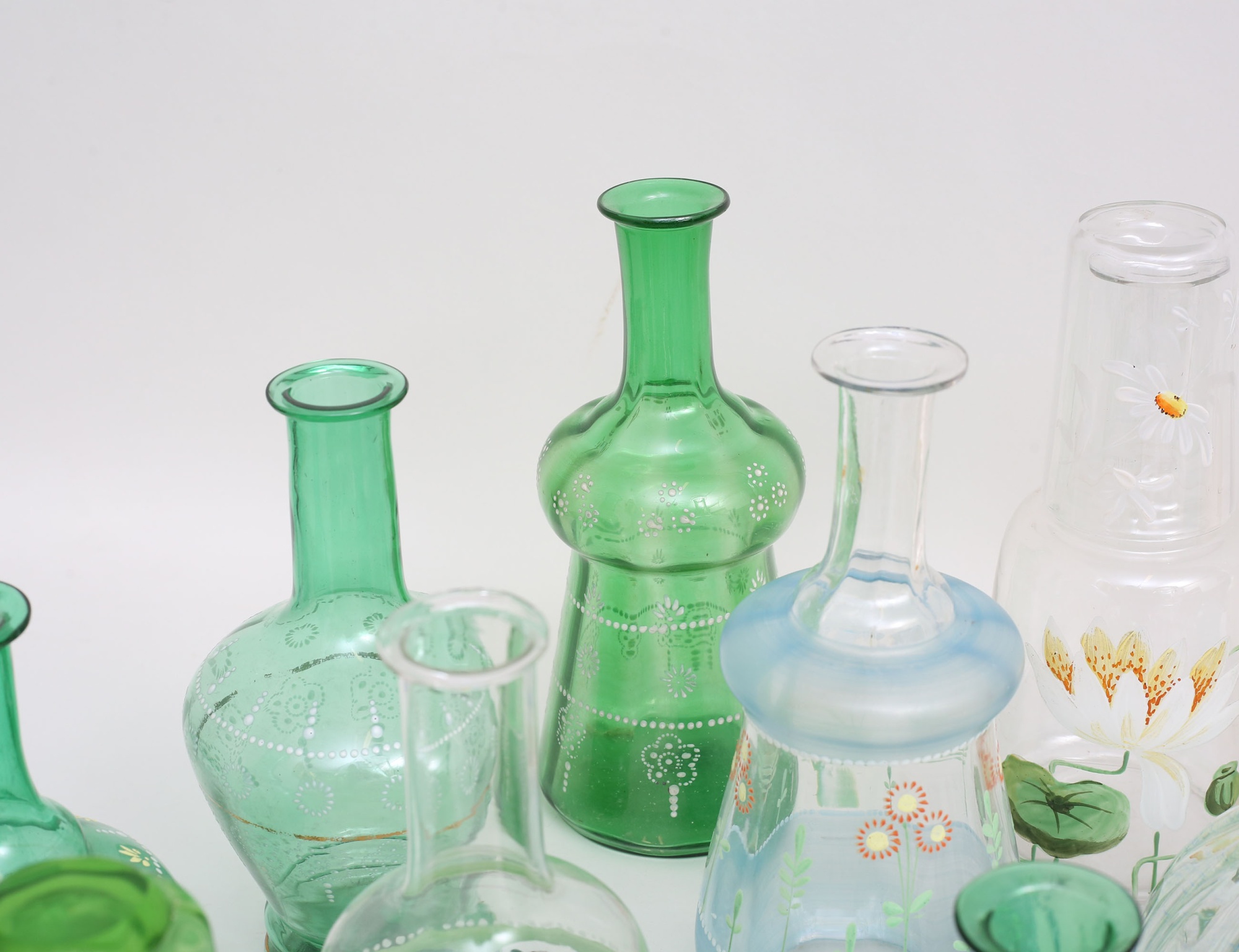 varav tre med glas, en del med målad dekor, höjd 19-25