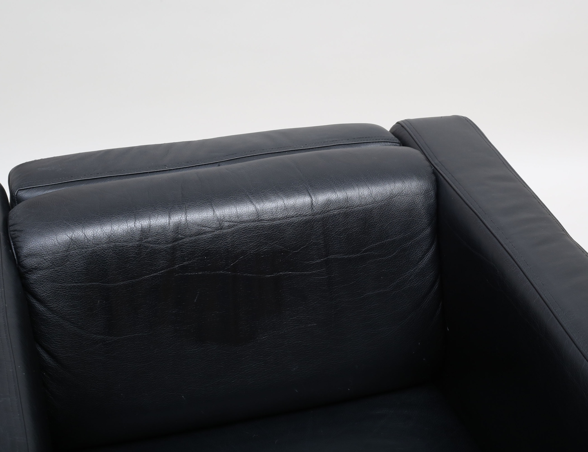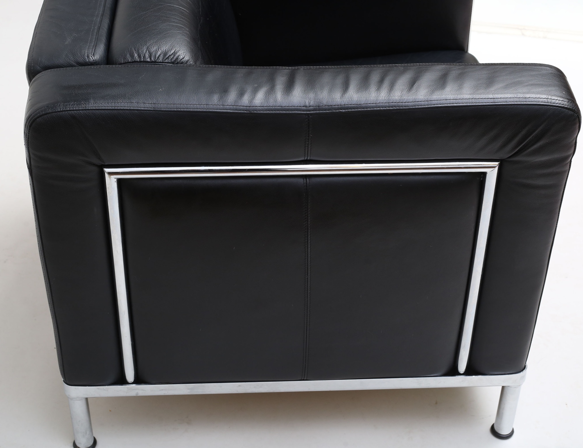svart skinn, kromad stomme, fasta stoppade dynor, etikettmärkt, sitthöjd ca. 42, höjd 68, bredd 75, djup 75