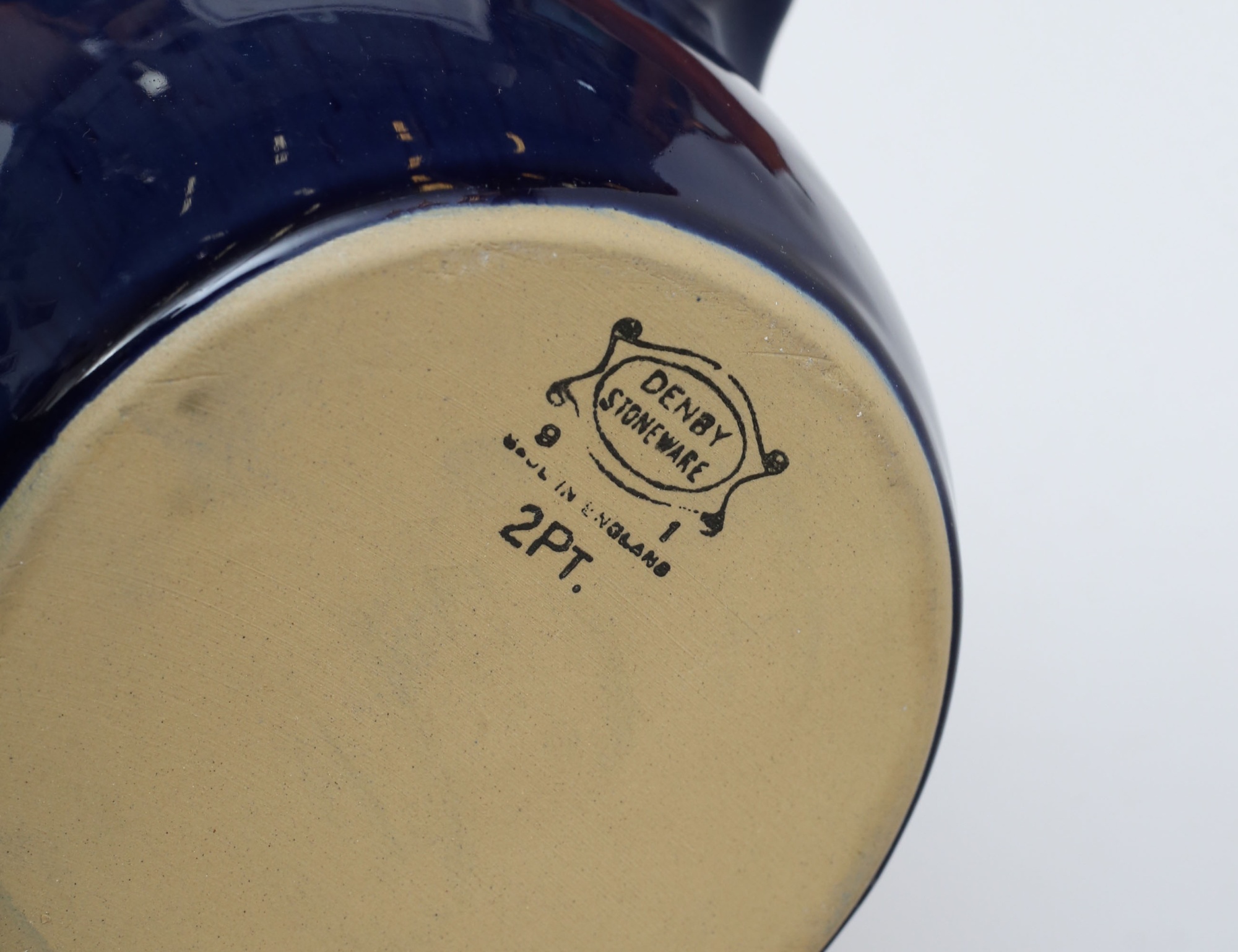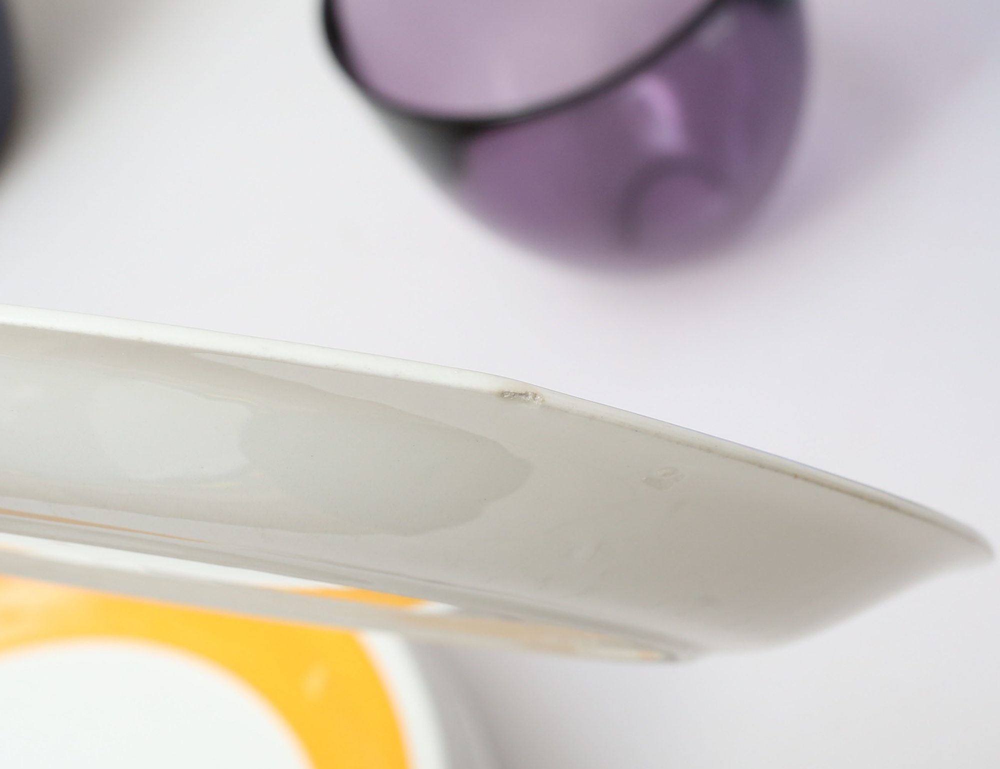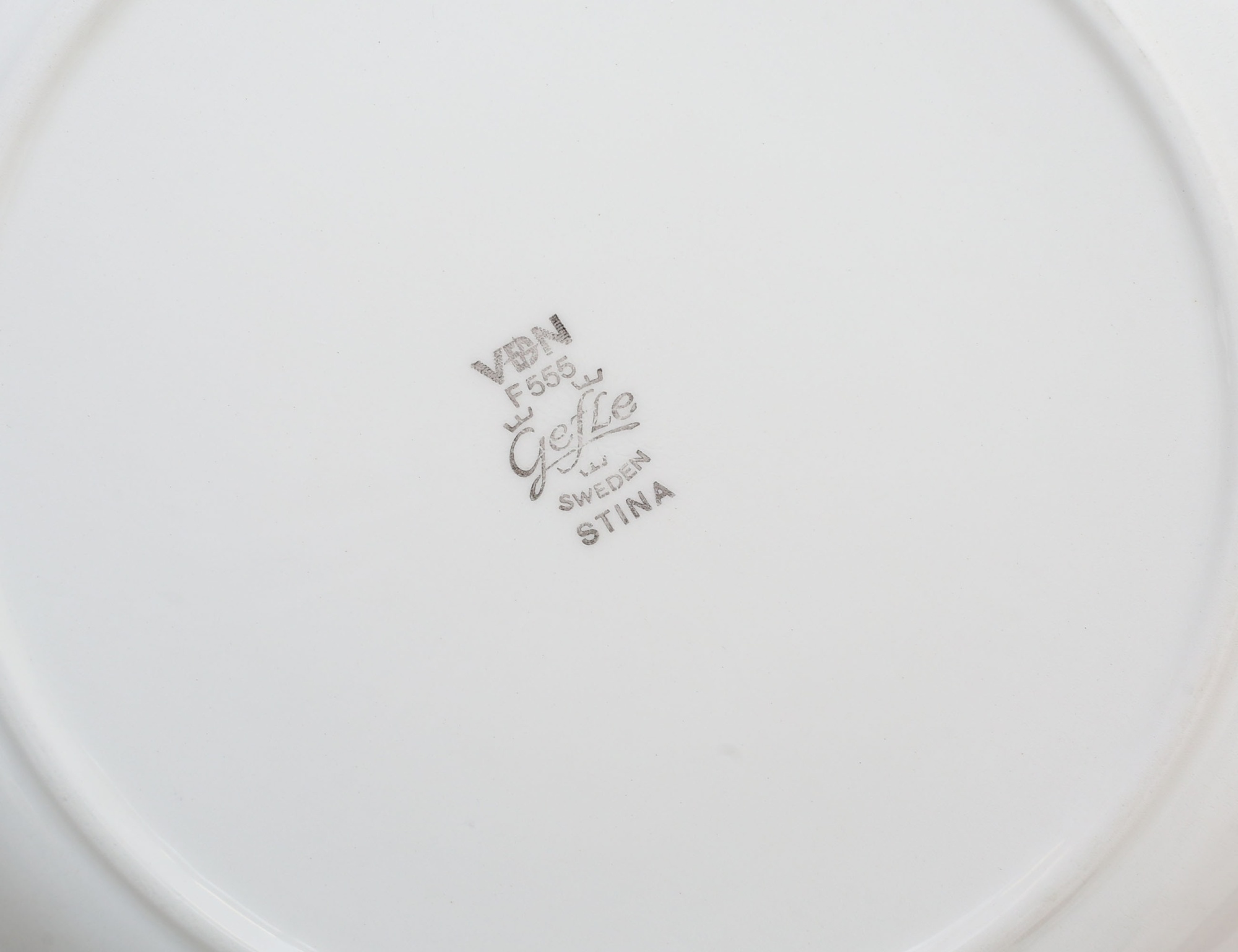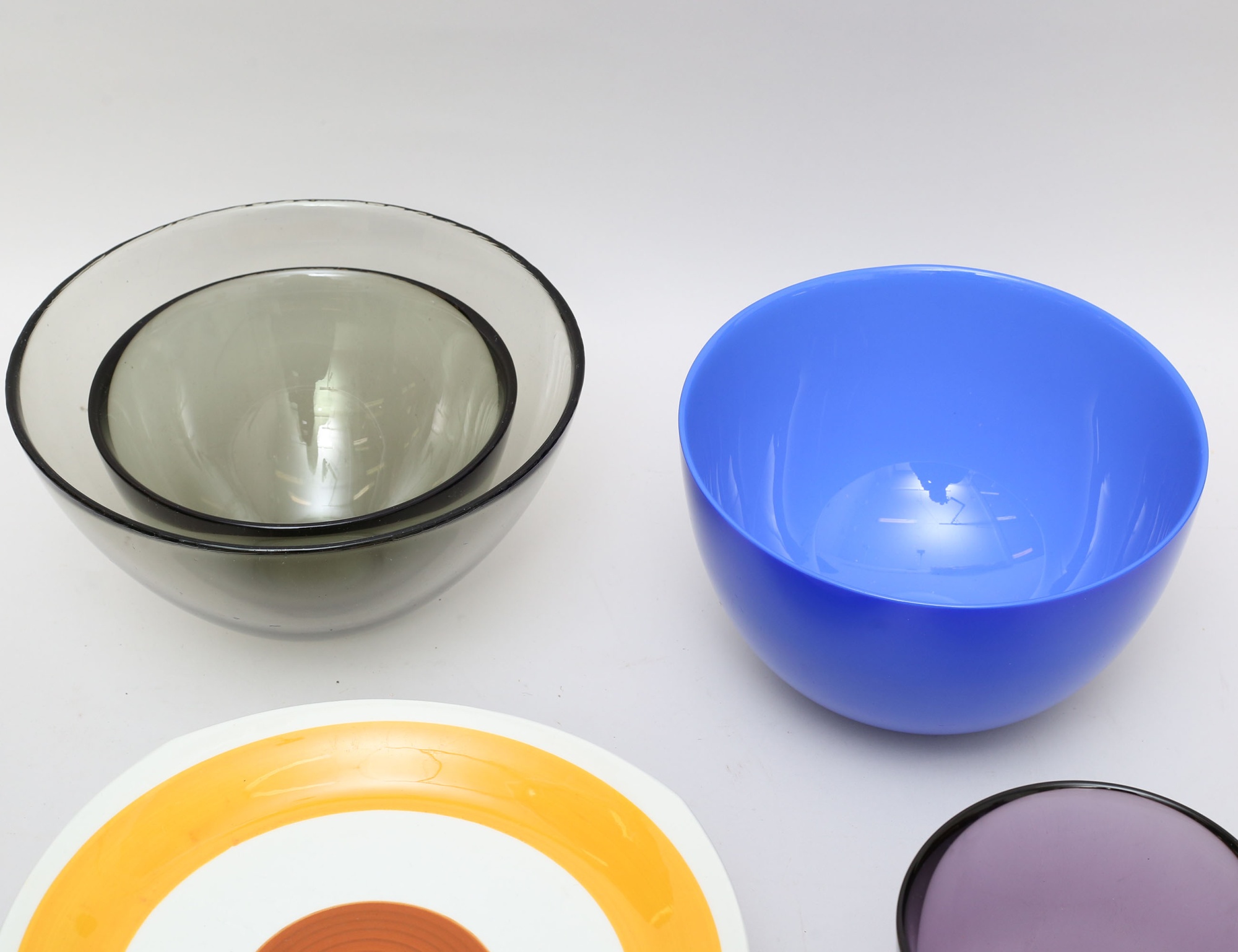 Helena Ringström Gefle, diameter 23, (en med obetydlig nagg), 3 skålar "Fuga", skål "Colora" - Sven Palmqvist Orrefors, karott med lock Denby stengods England, höjd 12