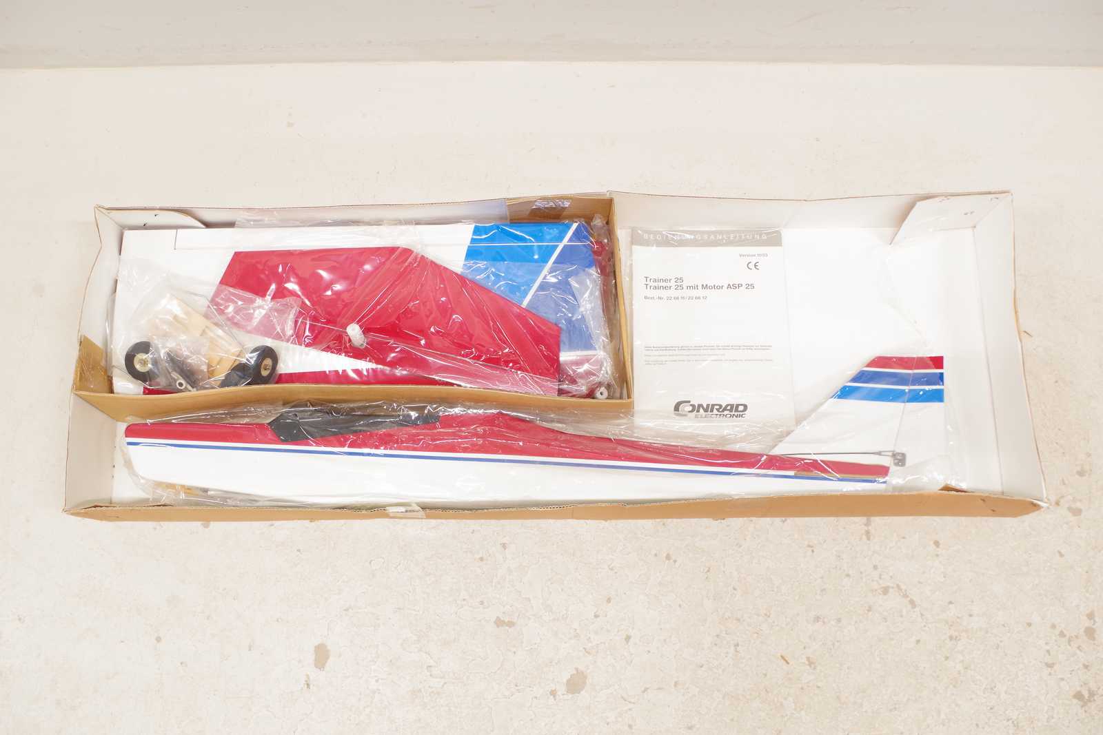 Auktioner Sport & Fritid MODELLFLYGPLAN med motor, Conrad electronic "Trainer 25 med Motor ASP 25", vingbredd: 130cm (nyskick/oanvänt, ett trasigt plan medföljer som reservdelar)