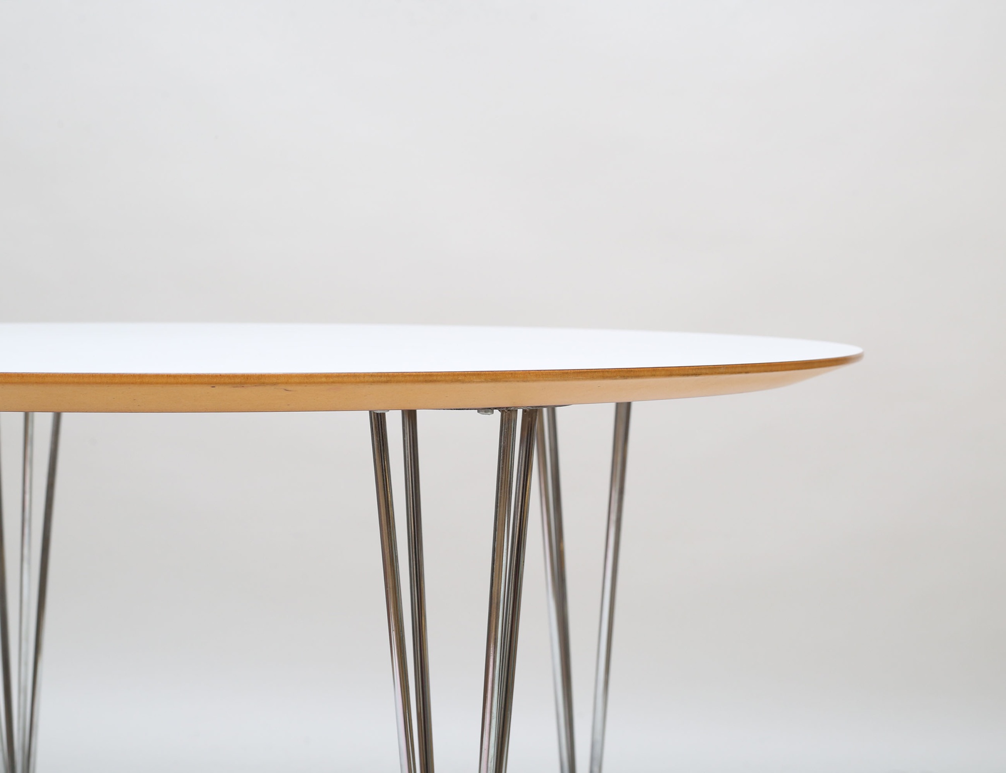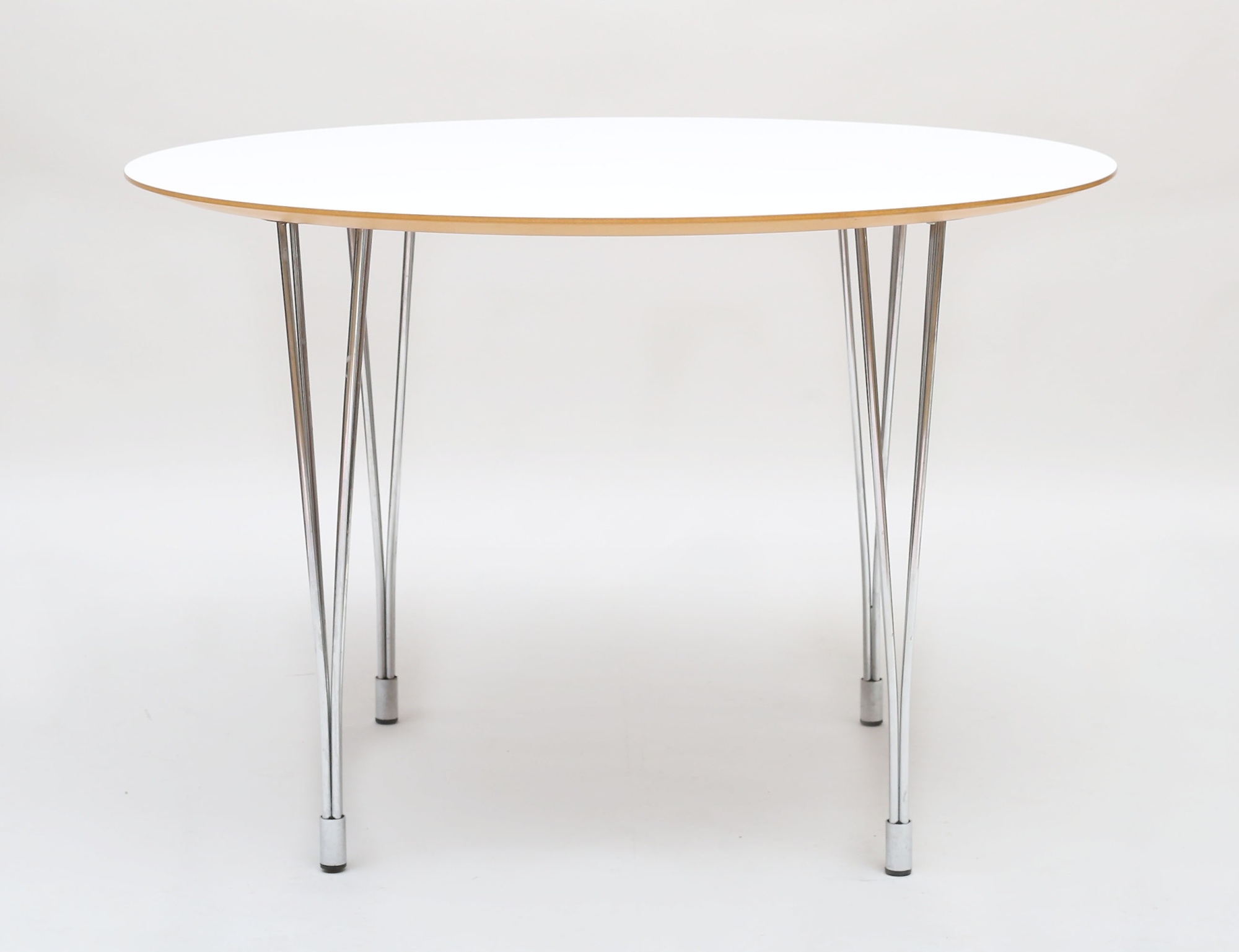 Snickis.se, rund skiva i vitt laminat, kromade ben (skruvar), närmast nyskick, höjd 73, diameter 110