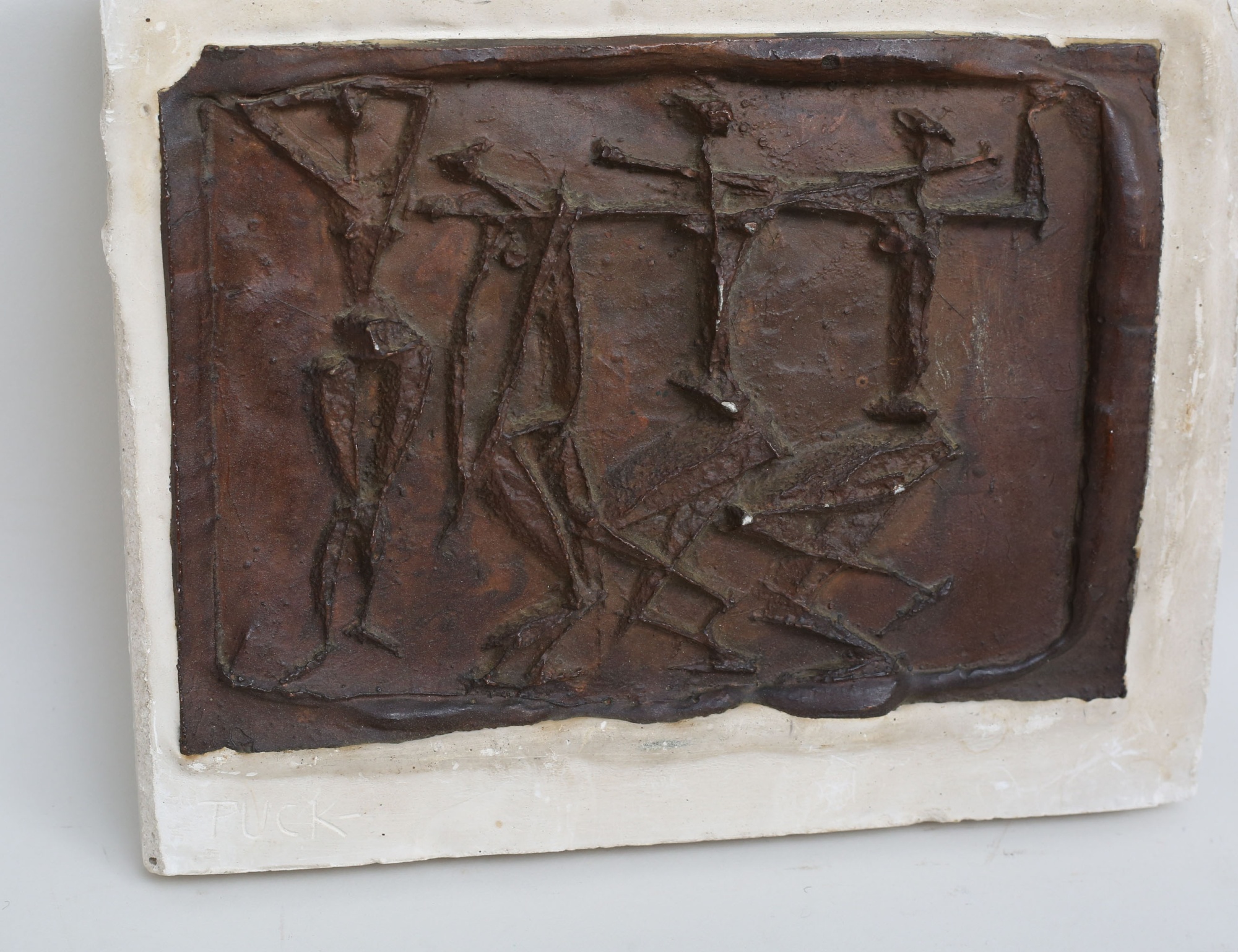 patinerad metall, varav en etikettmärkt, höjd 29/33, Puck Stocklassa väggrelief, konstmassa, 24x19,5 (hörn med lagning) (3)