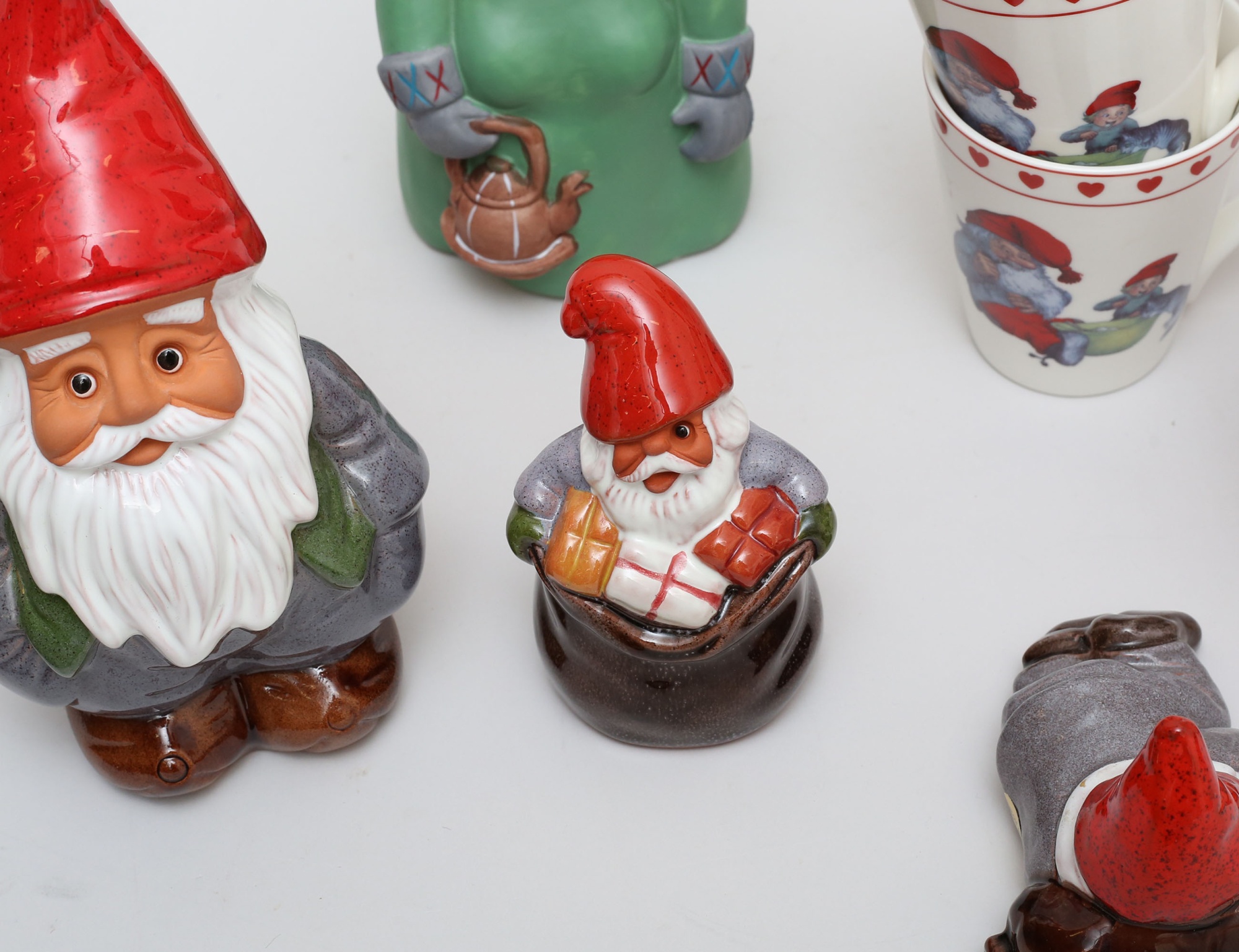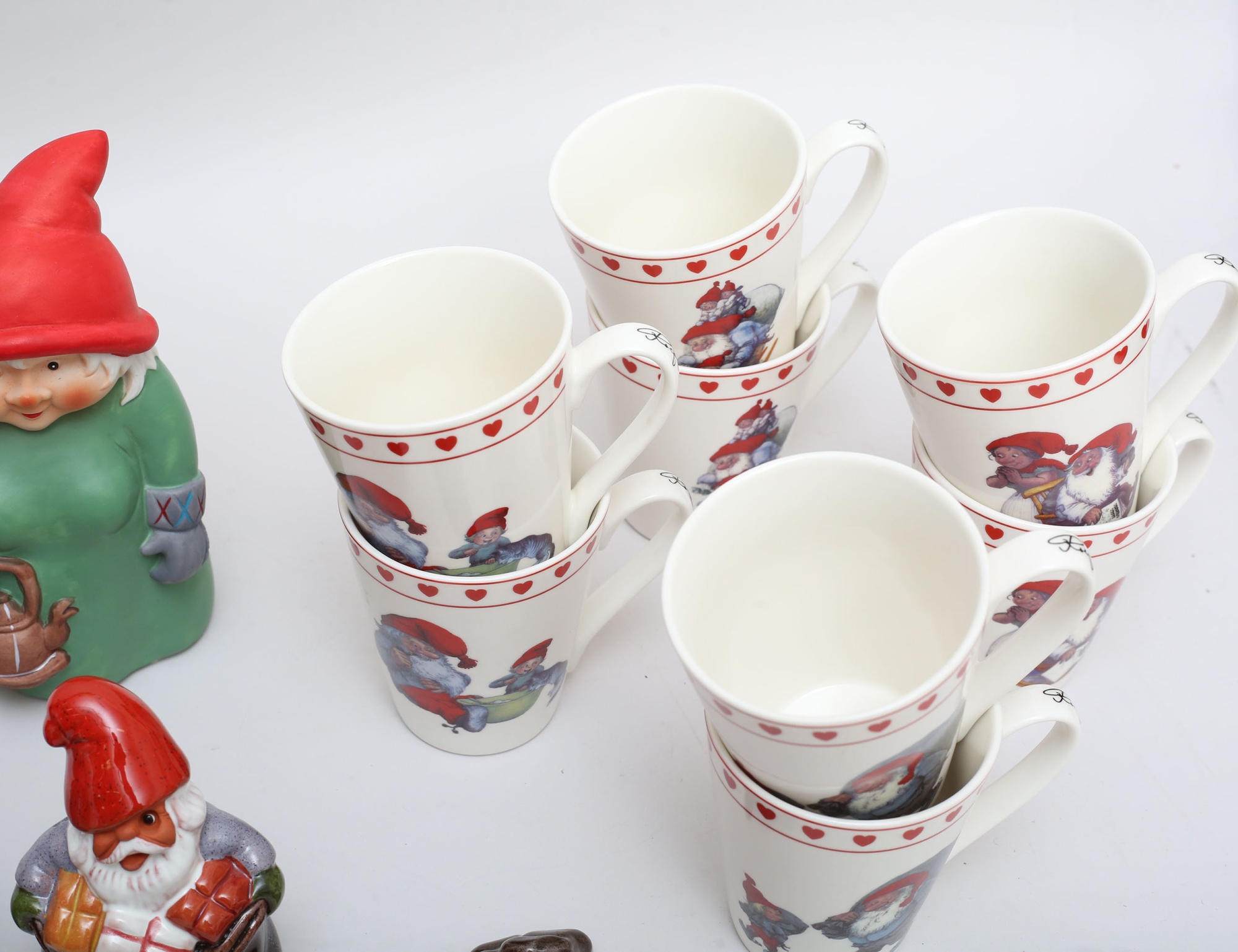 3 tomtar keramik, Rolf Berg, höjd 9/13/23, 8 muggar Rolf Lindberg, höjd 10, tomte Gun Ulriksson höjd 19