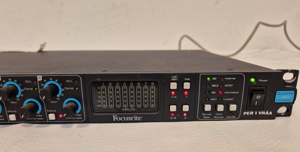 Förförstärkare FocusriteModell: Octopre mkII DynamicAnmärkning: Startar upp men är ej fuktionstestad, 1st optisk utgång defekt