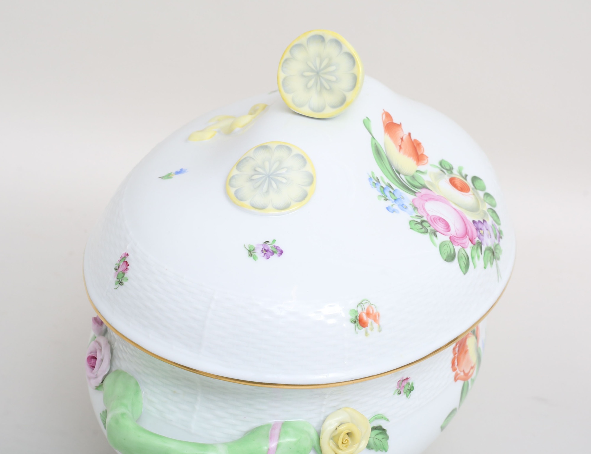 handmålad polykrom dekor, delvis i relief, lockknopp i form av citron, höjd 24, bredd 33x20