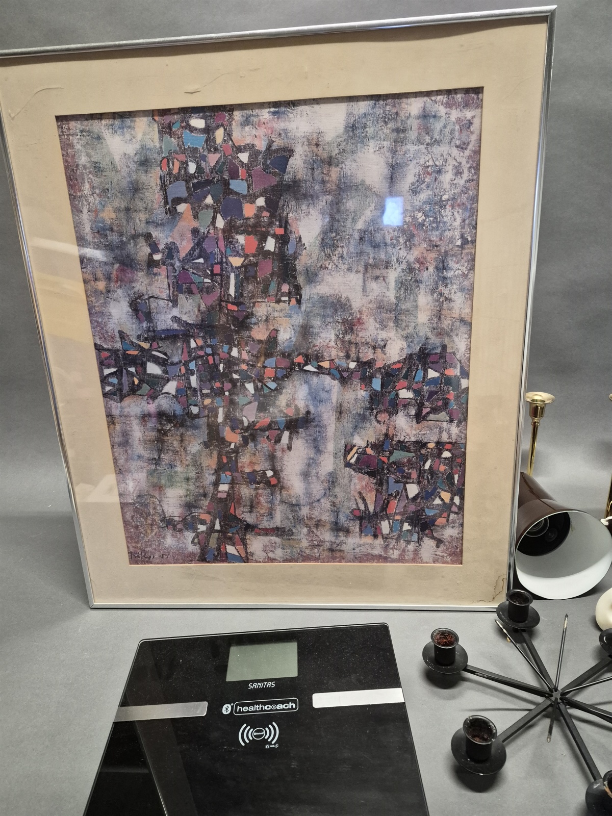 Bilder Parti bla tavla, metall och ljushållare, mått på tavla 65x56 cm