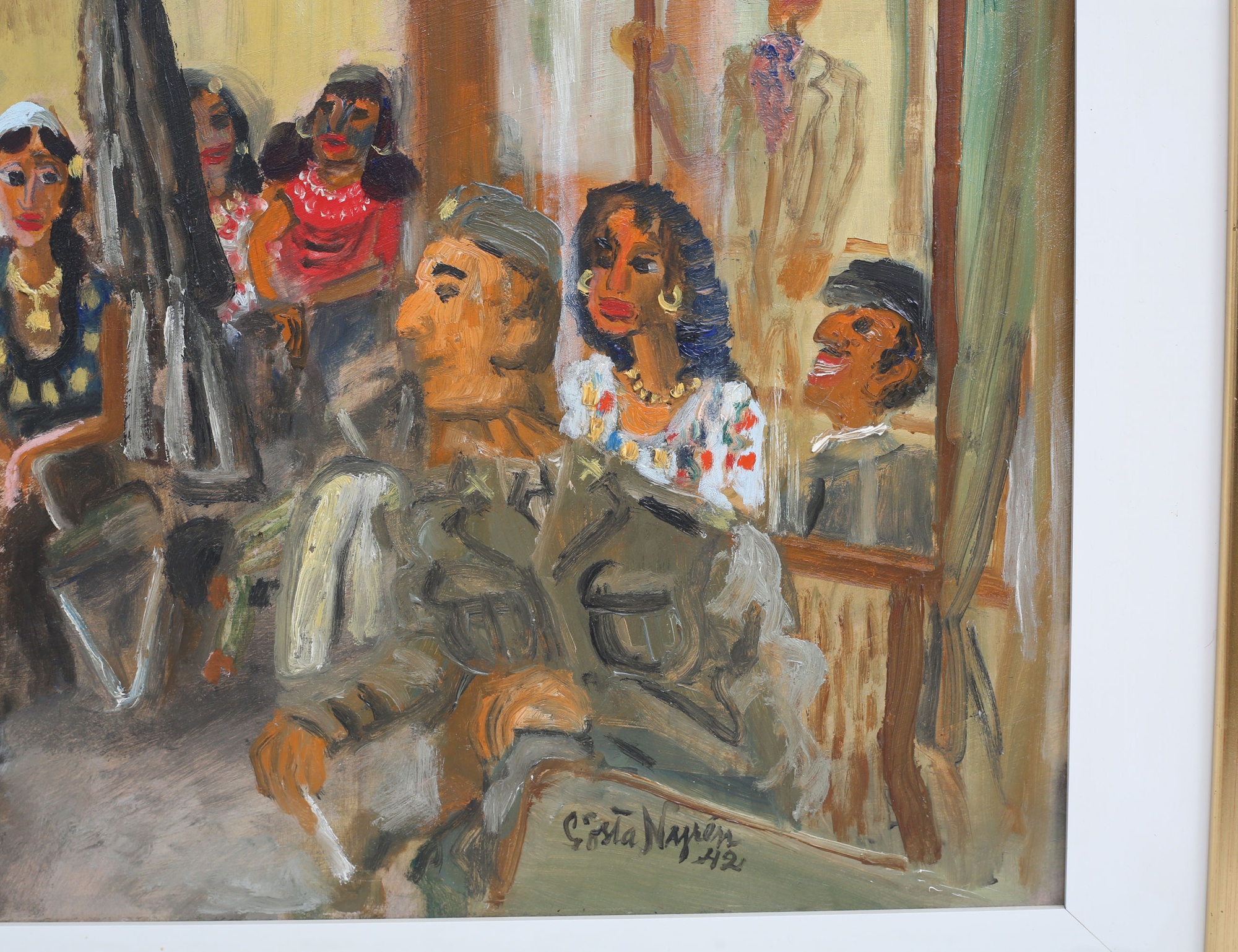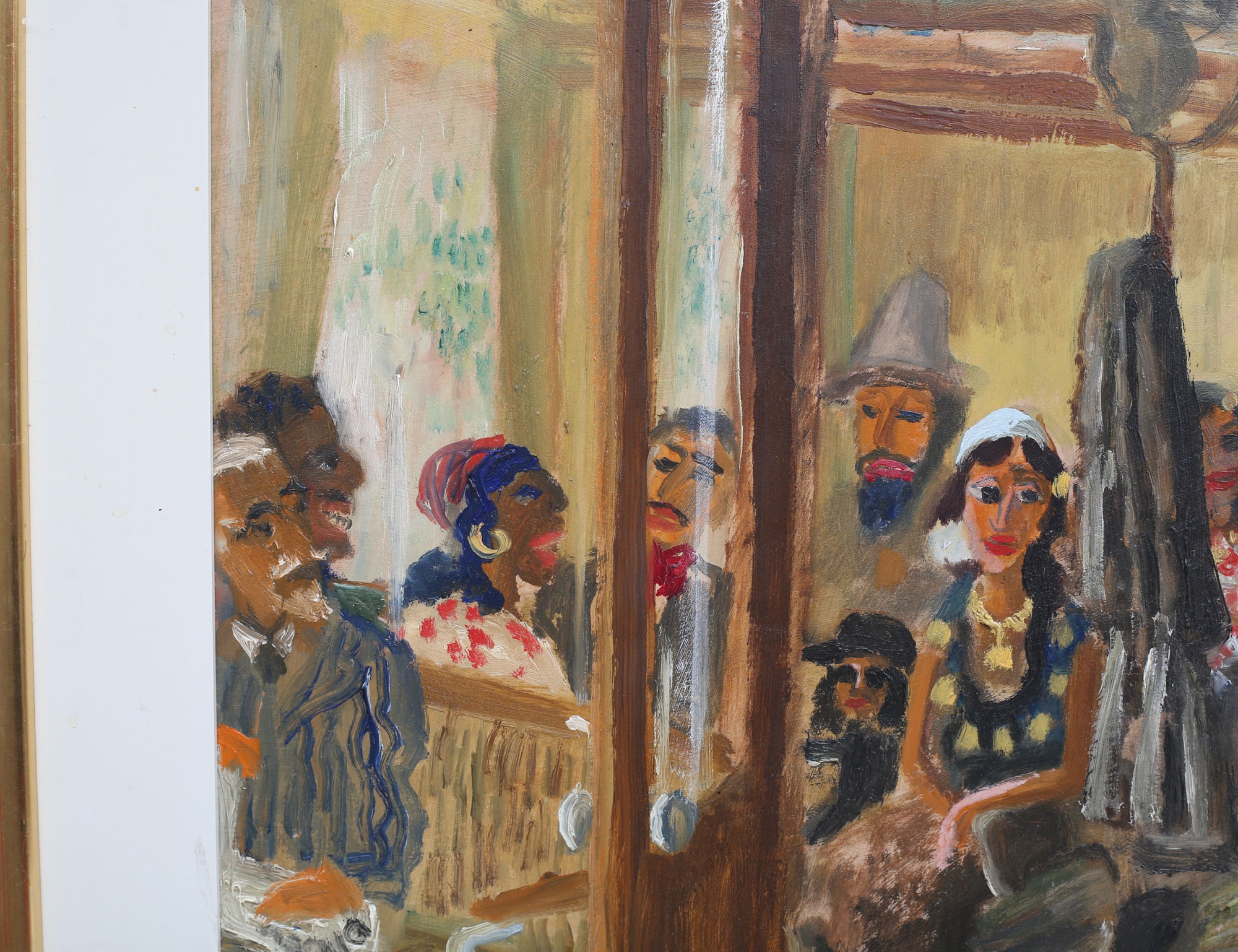 oljemålning på pannå, tågvagn med brokig samling figurer, signerad, 42x51, rammått 55x64