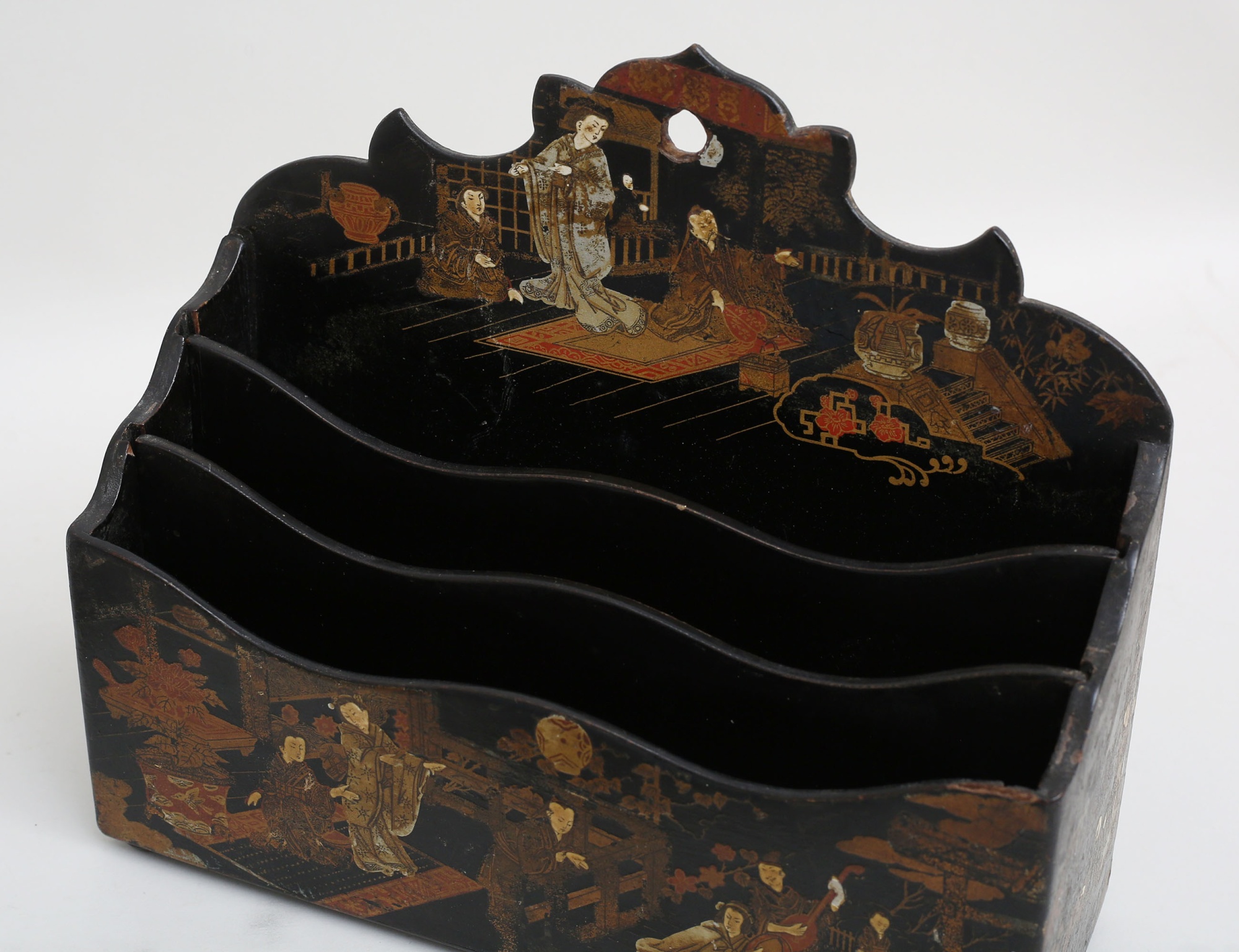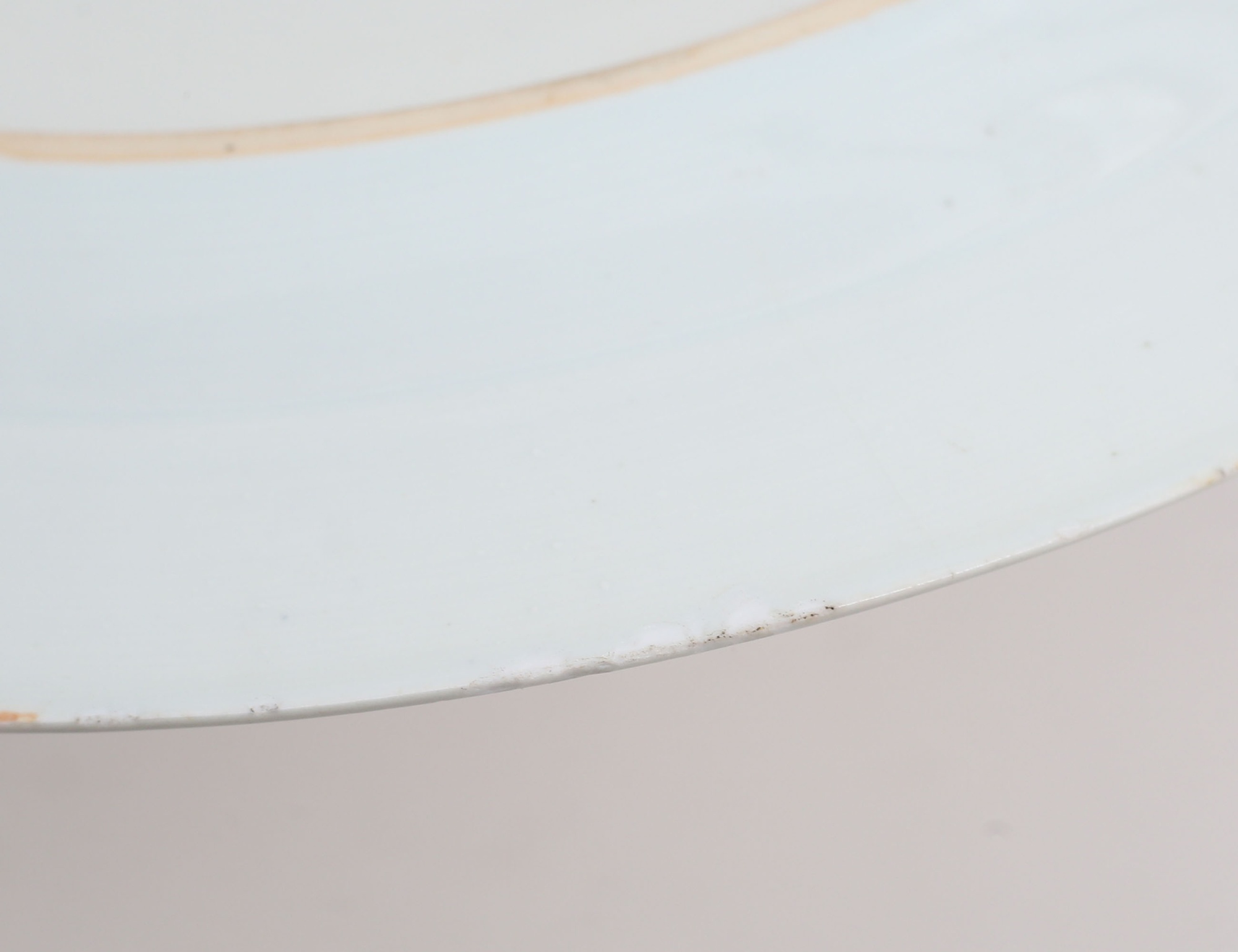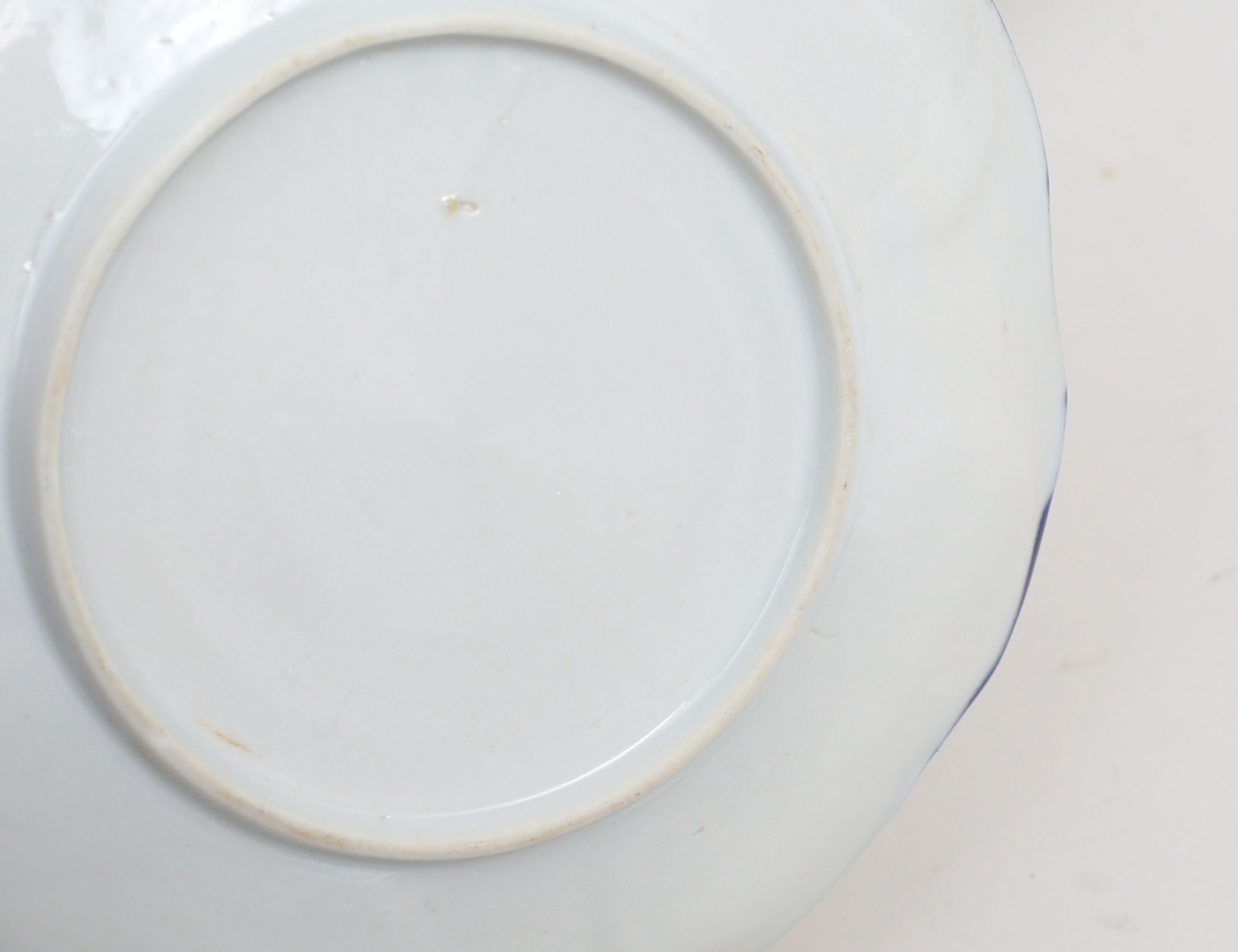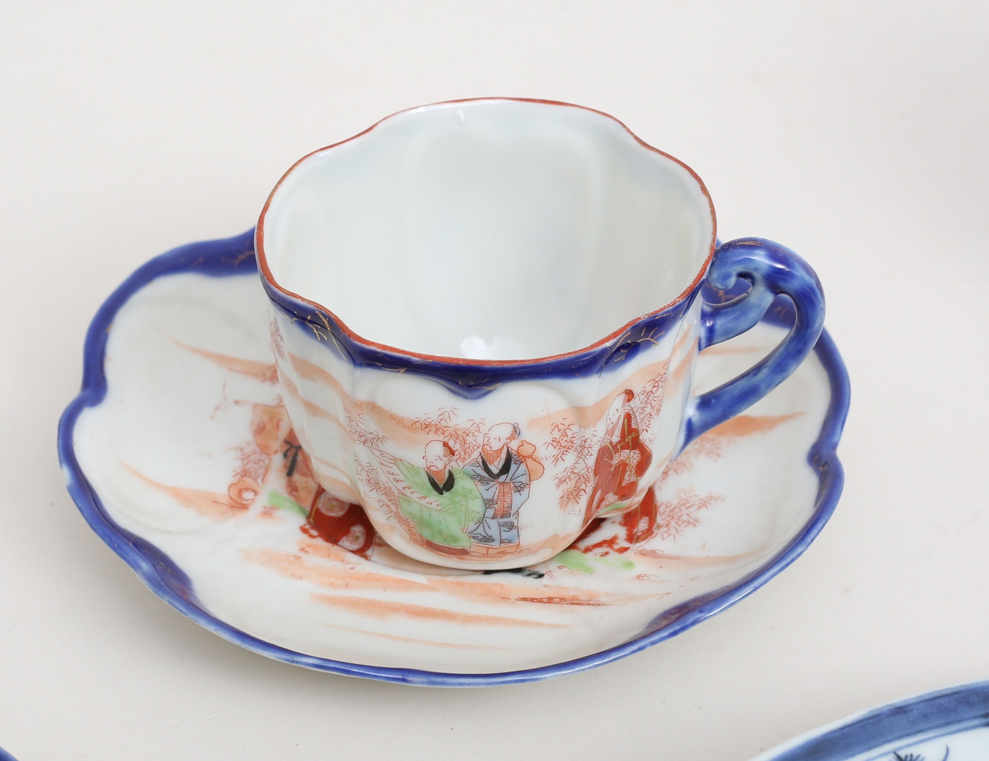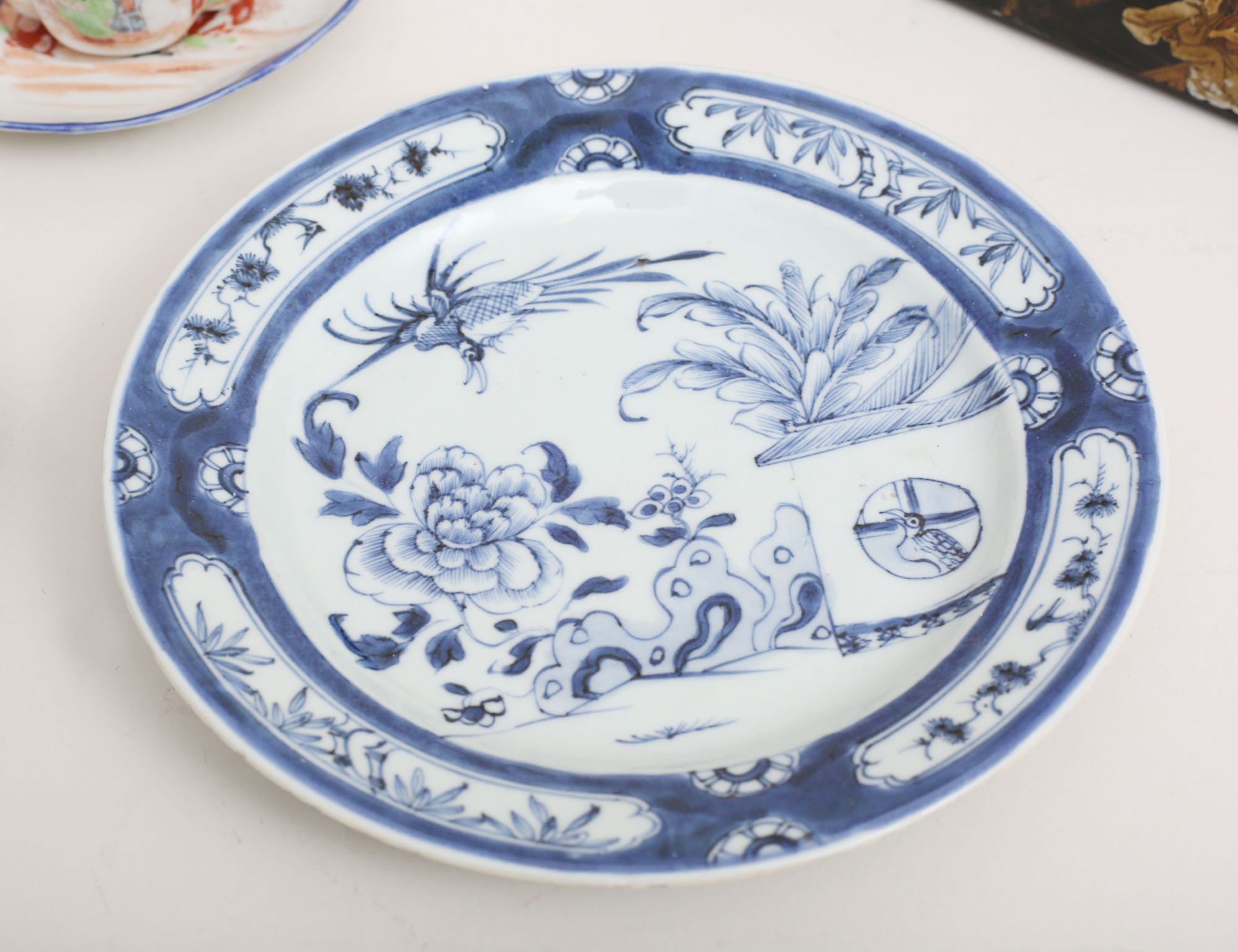 tallrik Qianlong 1736-1795, blåvit underglasyrdekor, diameter 23 (spricka, kantslitage), brevställ lackarbete, höjd 20, bredd 23, (en kulfot saknas), 1 par tekoppar med fat