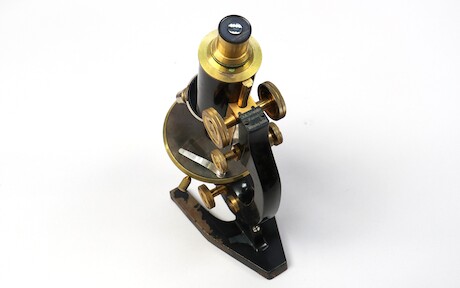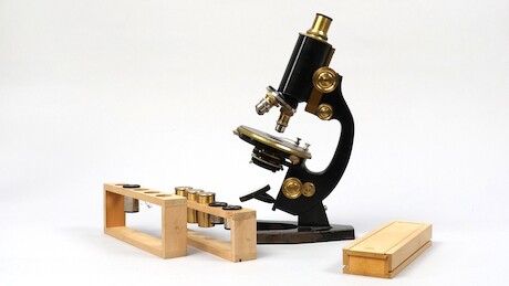Mikroskop med tillbehör, märkt "Dr Adolf Schröder/Kassel" men med objektiv och okular (troligen även stativarm mm.) från Otto Seibert Wetzlar, 1900-talets tidigare hälft