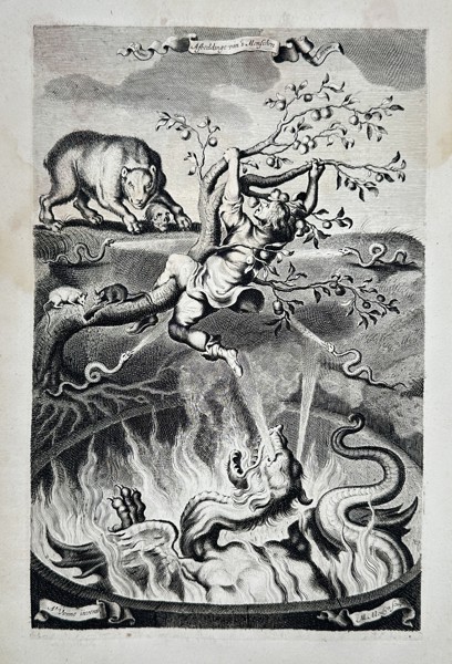 This allegorical print depicts a man clinging to the branches of a fruiting tree while suspended over a fiery pit inhabited by a multi-headed dragon. Above him, a bear prowls on the land, representing the constant threat of earthly dangers, while snakes and rats gnaw at the base of the tree and the man's limbs, symbolizing the steady erosion of time and mortality. This specific imagery is a visual adaptation of a moralizing parable from the works of Jacob Cats, designed to illustrate the precarious nature of human existence and the fleeting distractions of worldly pleasures. The composition serves a didactic purpose, urging the viewer to reflect on spiritual salvation amidst the inevitable perils of life.