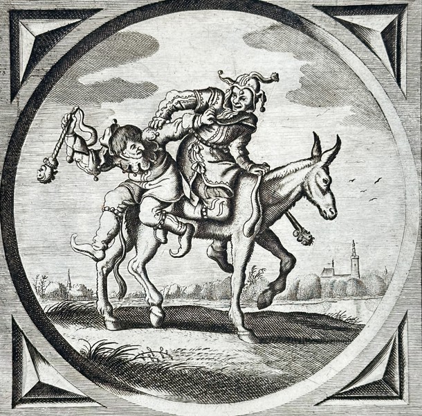 This moralizing engraving depicts two jesters or fools precariously riding a single donkey through a rural landscape. The central circular image is set within a rectangular frame and accompanied by extensive Dutch text and proverbs below, exploring themes of folly and social status. One fool holds a staff aloft while the donkey is shown in mid-stride, passing a distant church and village. This work is part of the literary and visual tradition of the Dutch Golden Age, using satirical imagery to provide ethical lessons and social commentary on the human condition.