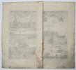 This topographical engraving presents a multi-panel view of significant architectural landmarks in the city of Goes, located in the province of Zeeland. The left side features a large perspective of the town square, dominated by the Gothic Town Hall with its distinctive clock tower and spire, while the foreground is bustling with horse-drawn carriages and figures. The right side is divided into three smaller panels depicting the Edelmans Herberg, the Old Man’s House, and the Noble Guard House, each identified by decorative scrolls. Two coats of arms held by cherubs hover in the sky, signifying the civic importance of the structures. This work is part of Smallegange's comprehensive historical and geographical study of the region, titled Nieuwe Cronyk van Zeeland, which documented the urban layout and monumental heritage of Dutch cities during the late seventeenth century.