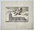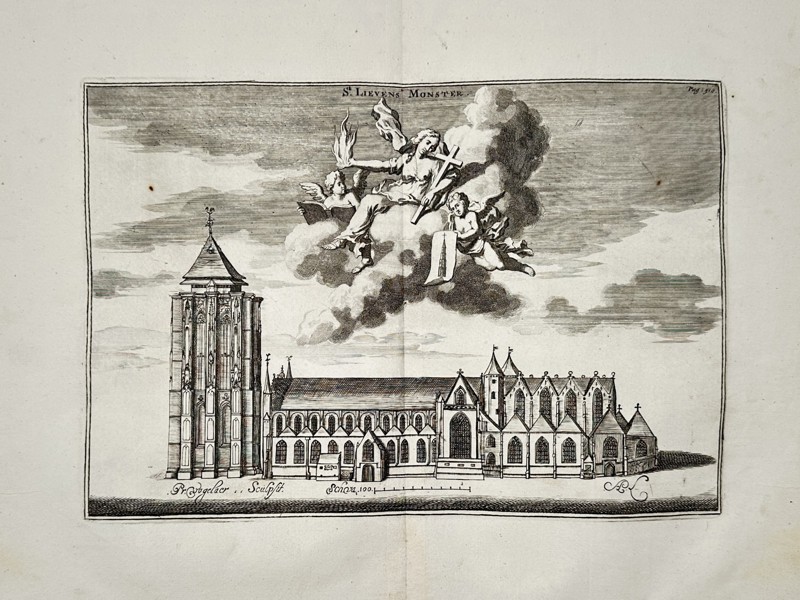 This topographical engraving depicts the Sint-Lievensmonster, a large Gothic church and its massive, unfinished bell tower located in Zierikzee, Zeeland. The composition shows the church in profile, highlighting the sheer scale of the tower, which was intended to be much taller but remained a heavy, truncated structure. Above the building, a celestial scene unfolds within the clouds, featuring an allegorical figure holding a torch and a cross, accompanied by cherubs. This work is part of Smallegange's Nieuwe Cronyk van Zeeland, an extensive historical project documenting the architecture and urban landscape of the region during the late seventeenth century.