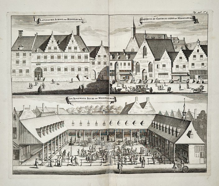 This topographical engraving presents a three-panel view of significant public and commercial buildings in Middelburg, the capital of the Zeeland province. The top left panel depicts the Latin School, a grand Renaissance-style building with multiple stepped gables where students received classical education. To its right, the Gasthuis and its associated church are shown, featuring a bustling street scene with figures and horse-drawn carriages in front of the charitable infirmary. The large bottom panel illustrates the Koopmans Beurs (Merchants' Exchange), a spacious courtyard surrounded by classical colonnades where traders gathered for commerce. This work is a primary plate from the Nieuwe Cronyk van Zeeland, meticulously documenting the architectural prosperity and civic infrastructure of the city during the Dutch Golden Age.