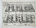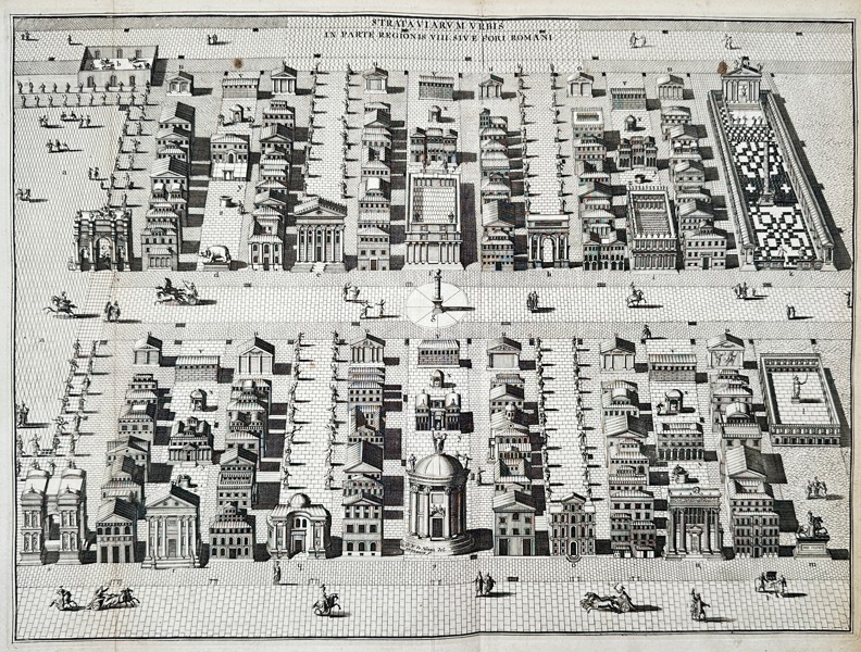 This topographical illustration provides a reconstruction of the ancient Roman Forum and its surrounding architectural landscape under the heading Strata Viarum Urbis. The plate displays a dense grid of classical temples, triumphal arches, and public buildings, including several circular tholos structures and the prominent Temple of Jupiter Optimus Maximus with its adjacent courtyard. The streets are populated with small figures on horseback and in chariots, offering a speculative visual representation of Roman urban life and monumental organization. This work is part of a series intended to document the history and topography of the ancient world, often based on archaeological theories and classical texts available during the early eighteenth century.