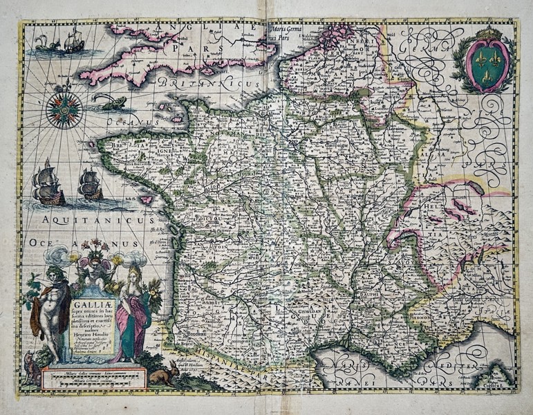 This hand-colored engraved map provides a comprehensive cartographic representation of the Kingdom of France, labeled Gallia. The detailed composition spans from the English Channel and the coast of Brittany in the west to the borders of Germany and Italy in the east, and from the Low Countries in the north to the Pyrenees and the Mediterranean Sea in the south. The map is embellished with a large decorative cartouche in the lower left corner featuring the title flanked by allegorical figures representing abundance, while the Royal Coat of Arms of France, bearing three fleurs-de-lis, adorns the upper right corner. Maritime elements, including sailing vessels and a compass rose, decorate the ocean areas, reflecting the artistic standards of seventeenth-century atlas production. This work originates from the renowned Mercator-Hondius atlas, which served as a primary geographic reference throughout Europe.