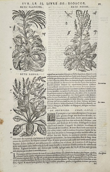 This botanical illustration presents a systematic study of three varieties of beet and the common purslane plant. The upper portion of the page features detailed woodcuts of white beet, black beet, and red beet, each showing the characteristic large leaves and elongated seed stalks. Below these, a separate illustration depicts the common purslane with its thick, succulent leaves and central root system. The accompanying French text provides a medicinal and descriptive commentary on the properties and uses of these plants, categorizing them according to the classical traditions of natural history. This work is a primary leaf from Mattioli's commentary on the medical treatises of Dioscorides, which served as the most influential pharmacological and botanical reference in Europe during the Renaissance.