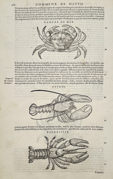 This illustration presents a systematic study of three crustacean species across vertical sections. The upper portion features a detailed woodcut of a sea crab, labeled Cancre de Mer, showing its rounded carapace and jointed walking legs. The middle section depicts a large European lobster, titled Astase, with its prominent elongated antennae and robust primary claws. The bottom section illustrates a common freshwater crayfish, identified as Escrevisse, displaying its segmented tail and smaller pincers. The accompanying French text provides a scholarly commentary on the natural history, habitat, and dietary or medicinal properties of these creatures, comparing their physical traits to the descriptions found in classical literature. This page is a primary leaf from Mattioli's commentary on the medical treatises of Dioscorides, which served as the most influential pharmacological and biological reference in Europe during the Renaissance.