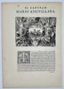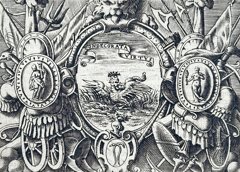 This engraving presents a heraldic device or impresa dedicated to Captain Mario Anguillara, a member of an ancient and noble family celebrated for their military prowess. The central image, contained within an oval frame, depicts a crowned eagle rising from the waves, surmounted by a motto on a flowing scroll. This central scene is flanked by elaborate trophies of war, including shields, banners, and suits of armor, emphasizing the martial achievements of the Anguillara lineage. Below the illustration, a decorative drop-cap initiates a block of Italian text that provides a biographical and moral commentary on the Captain’s character and the history of his family. This work serves as an intellectual emblem intended to celebrate the honor, nobility, and military virtue of the subject within the artistic traditions of the late Renaissance.
