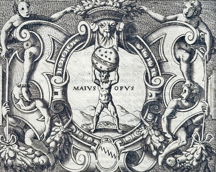 This engraving presents a heraldic device or impresa dedicated to Guido Bentivoglio. The central image, set within an elaborate Mannerist cartouche, depicts the mythological figure of Atlas supporting a celestial globe on his shoulders, accompanied by the Latin motto Maius Opus. The ornate frame features two reclining male figures atop architectural scrolls, with garlands of fruit and a central grotesque mask at the top. Below the illustration, a decorative drop-cap initiates a block of Italian text titled A Favola D'Atlante Presso, which provides a scholarly commentary on the myth of Atlas and its allegorical significance regarding strength and intellectual pursuit. This work serves as an intellectual emblem intended to celebrate the status and character of the subject within the refined artistic traditions of the late Renaissance.