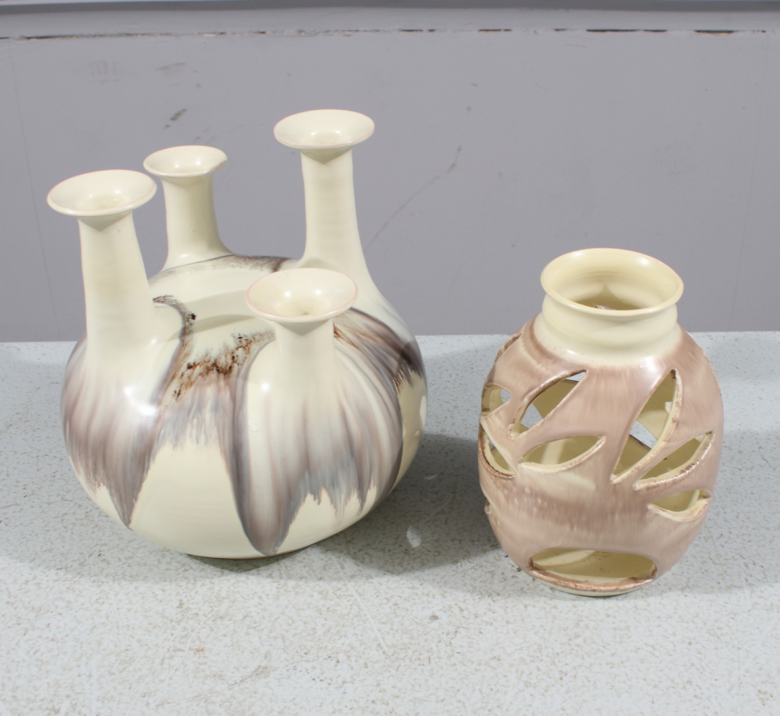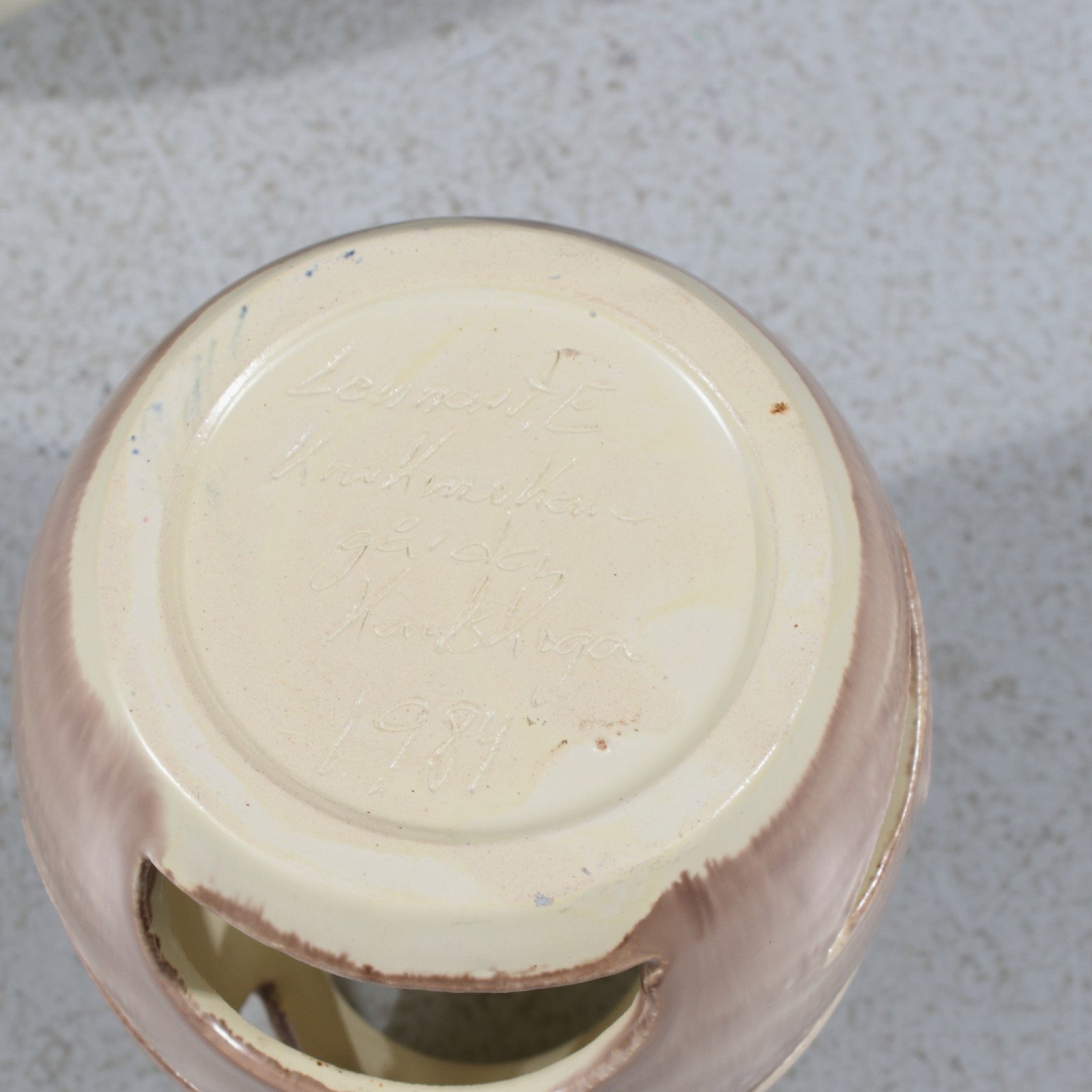 2 delar, keramik, 1st 4-armad ljusstake samt 1st ljuslykta, signerade samt daterade 1983 samt 1984, liten glasyrnagg/tillverkningsdefekt på 1st ljuspipa, höjd 15-19,5 cm. (vån3)