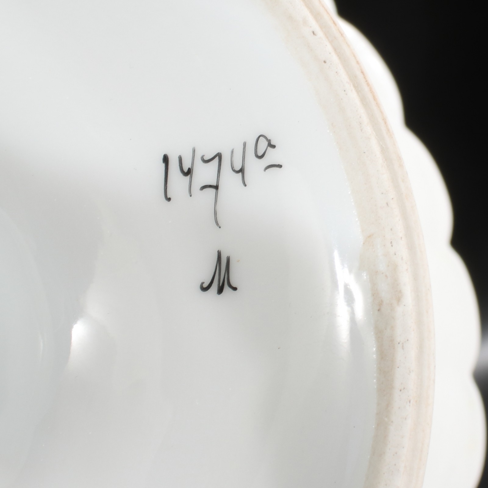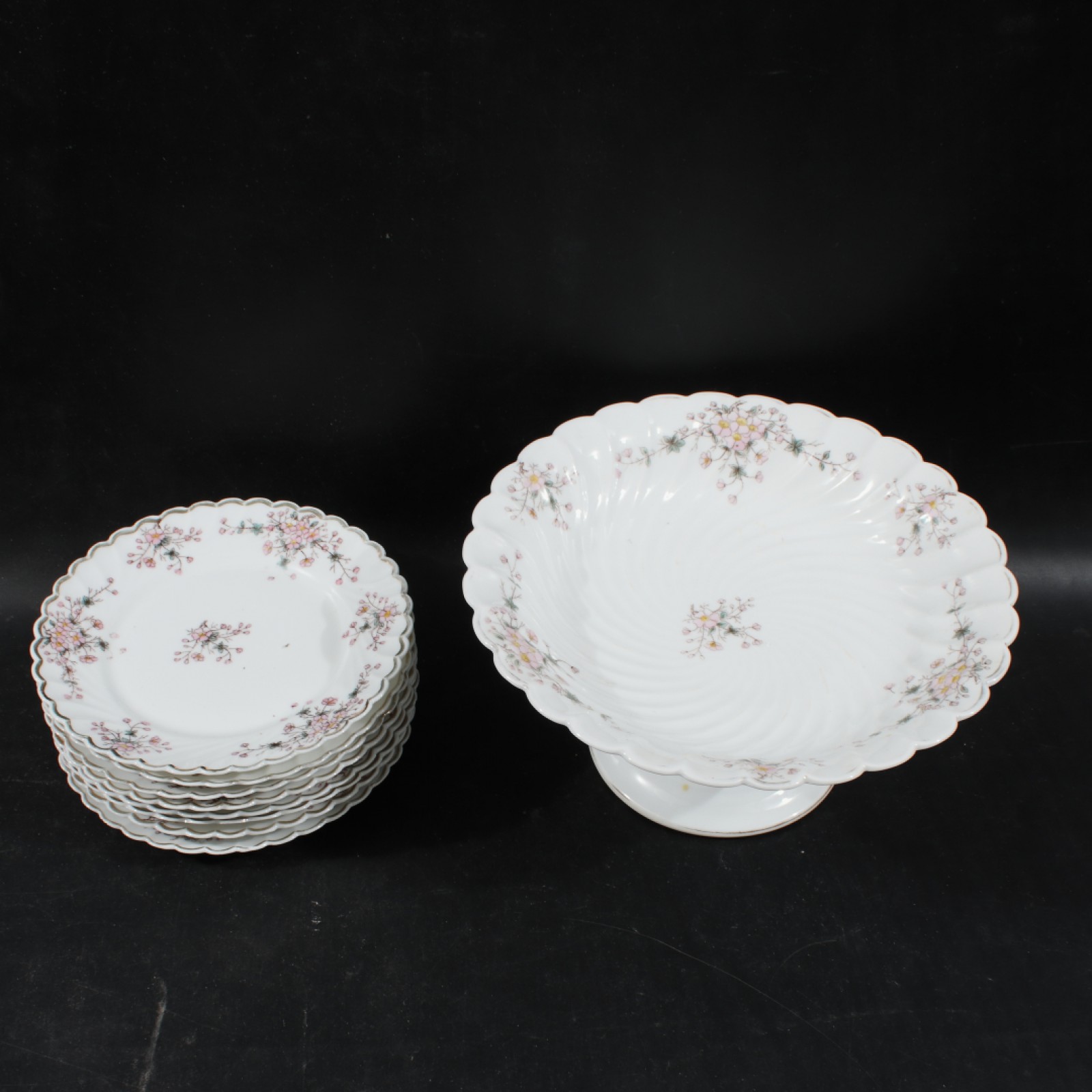 9 delar, porslin, 1st kakfat på fot samt 8st assietter, 1900-talets första hälft, diameter 17-24 cm, höjd kakfat 11,5 cm. (vån3)