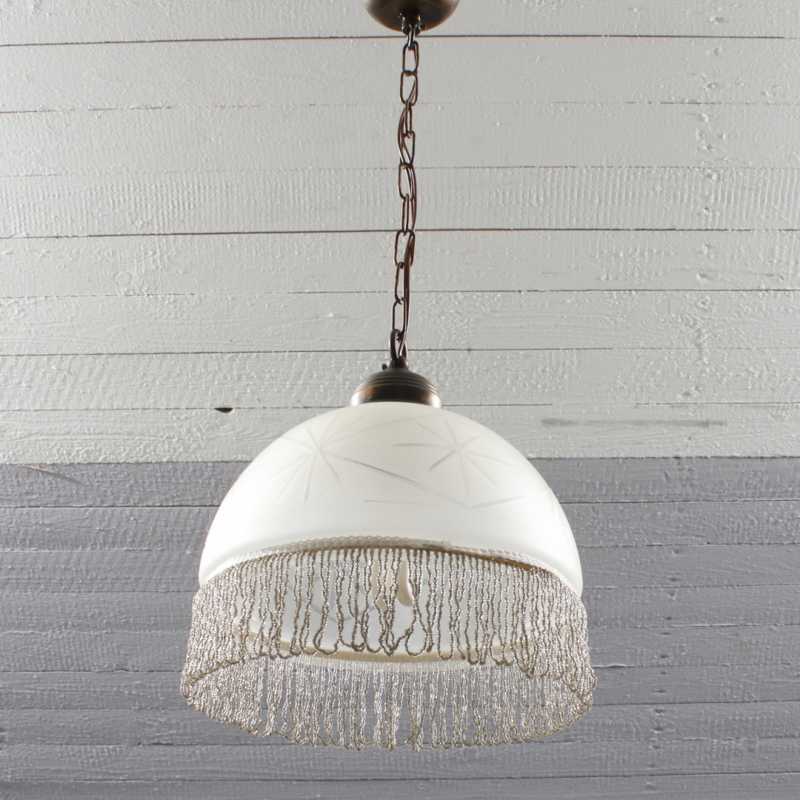 Frostat glas med slipad dekor, pärlfrans, höjd utan kedja ca:25 cm, diameter 25 cm. (vån1)