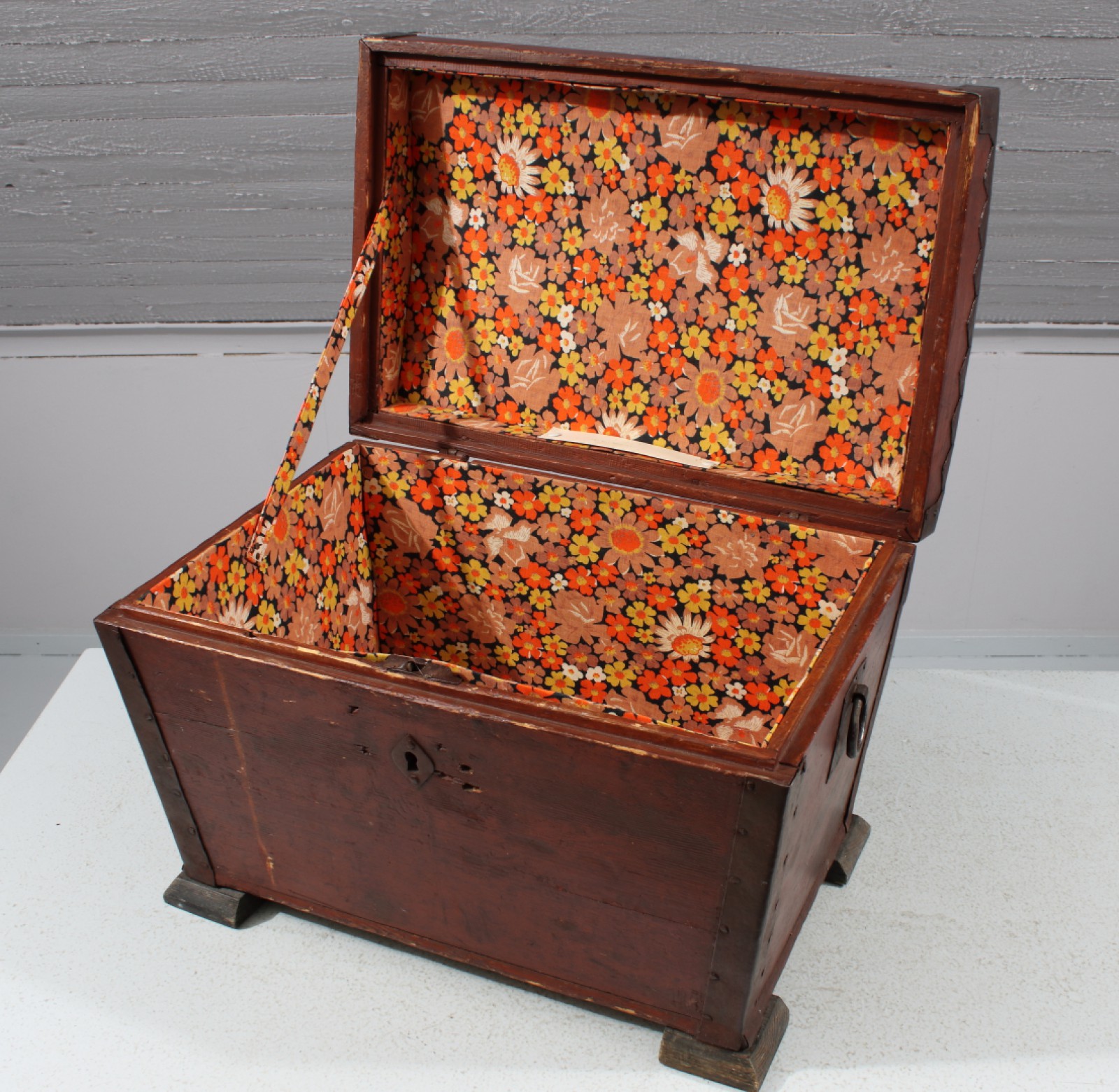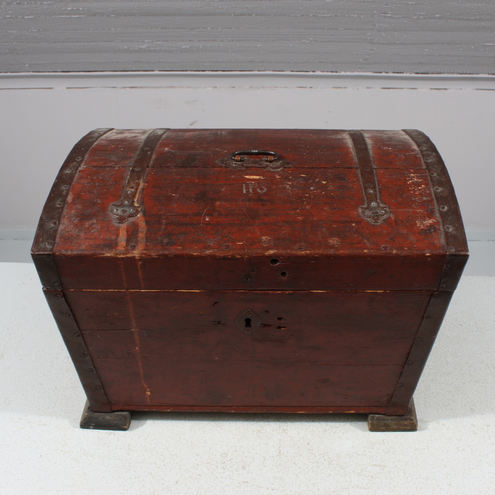 Trä och smide, upplåst men nyckel saknas, åldersrelaterat slitage (patina), H.33,5, B.48, Dj.32 cm. (vån3)