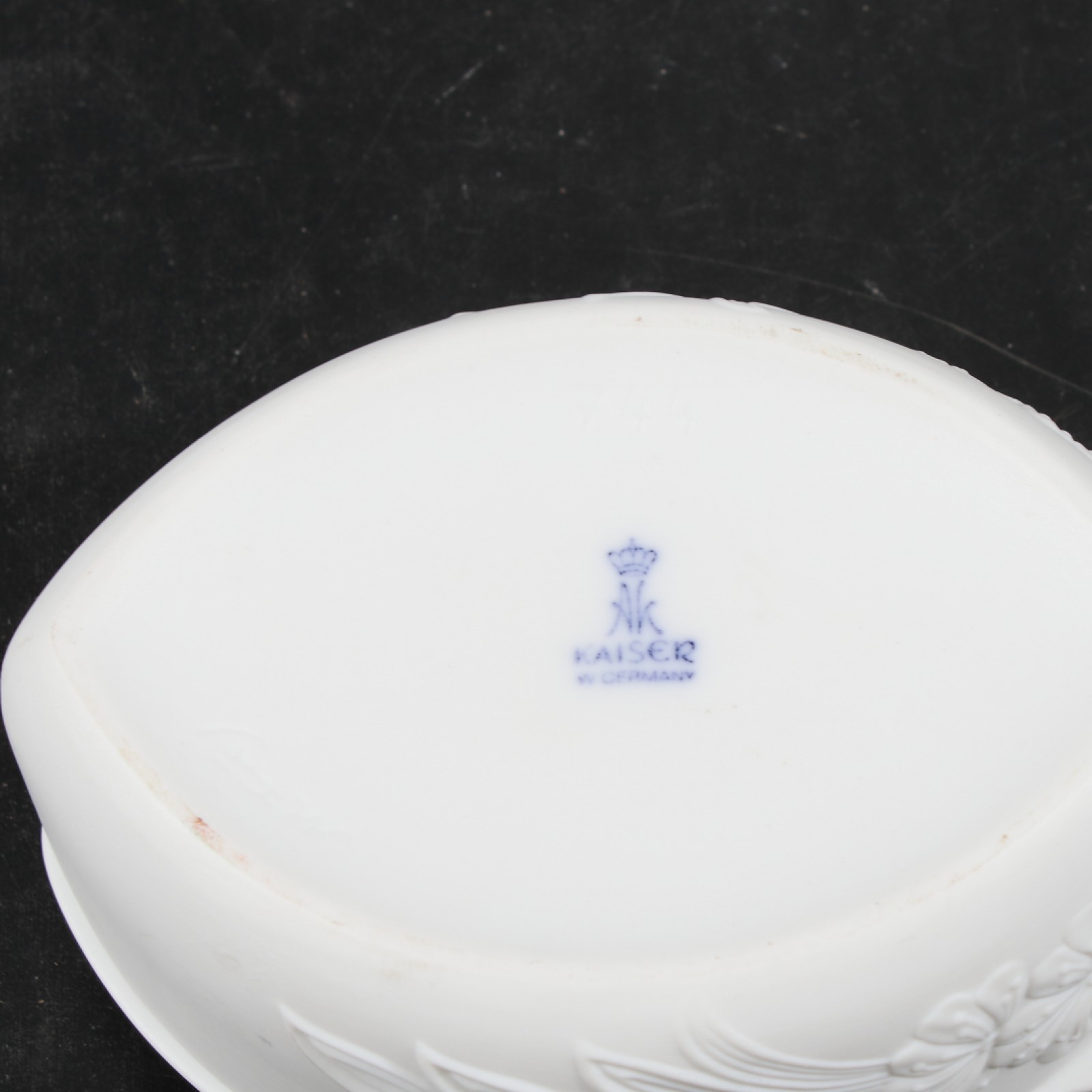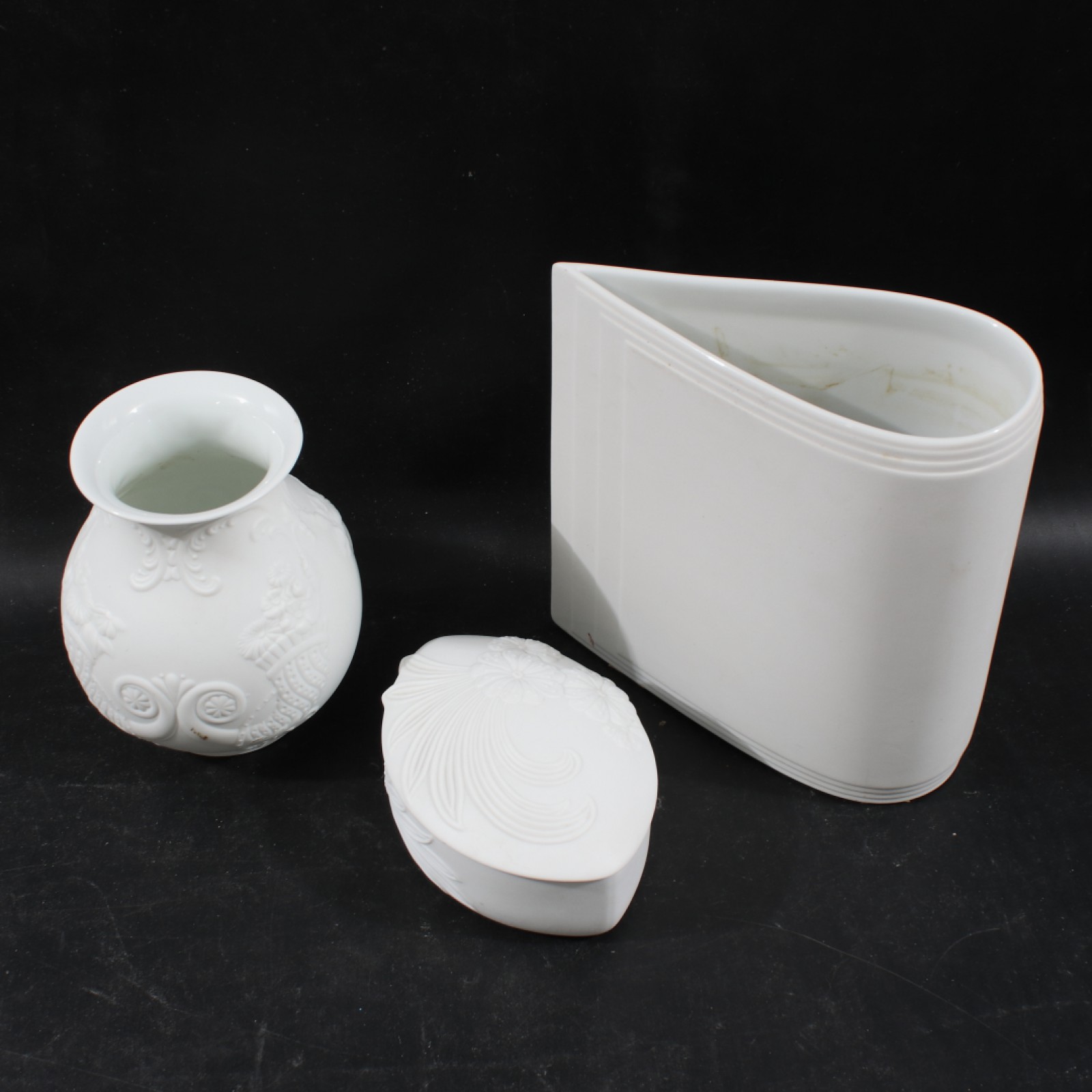 3 delar, porslin, 1st Rosenthal vas, 1st vas samt 1st lockask Kaiser med dekor i relief, höjd 6,5-20,5 cm. (vån3)