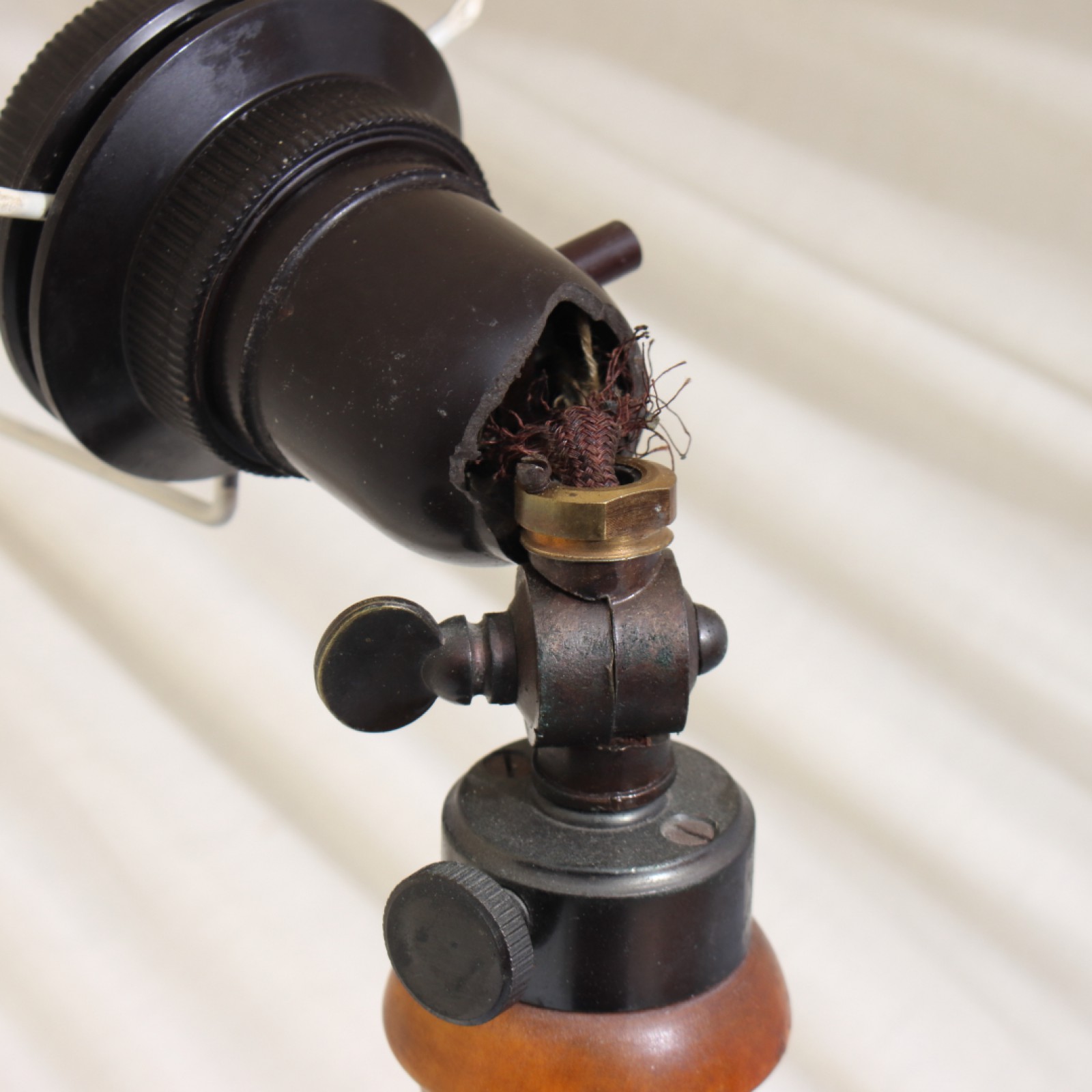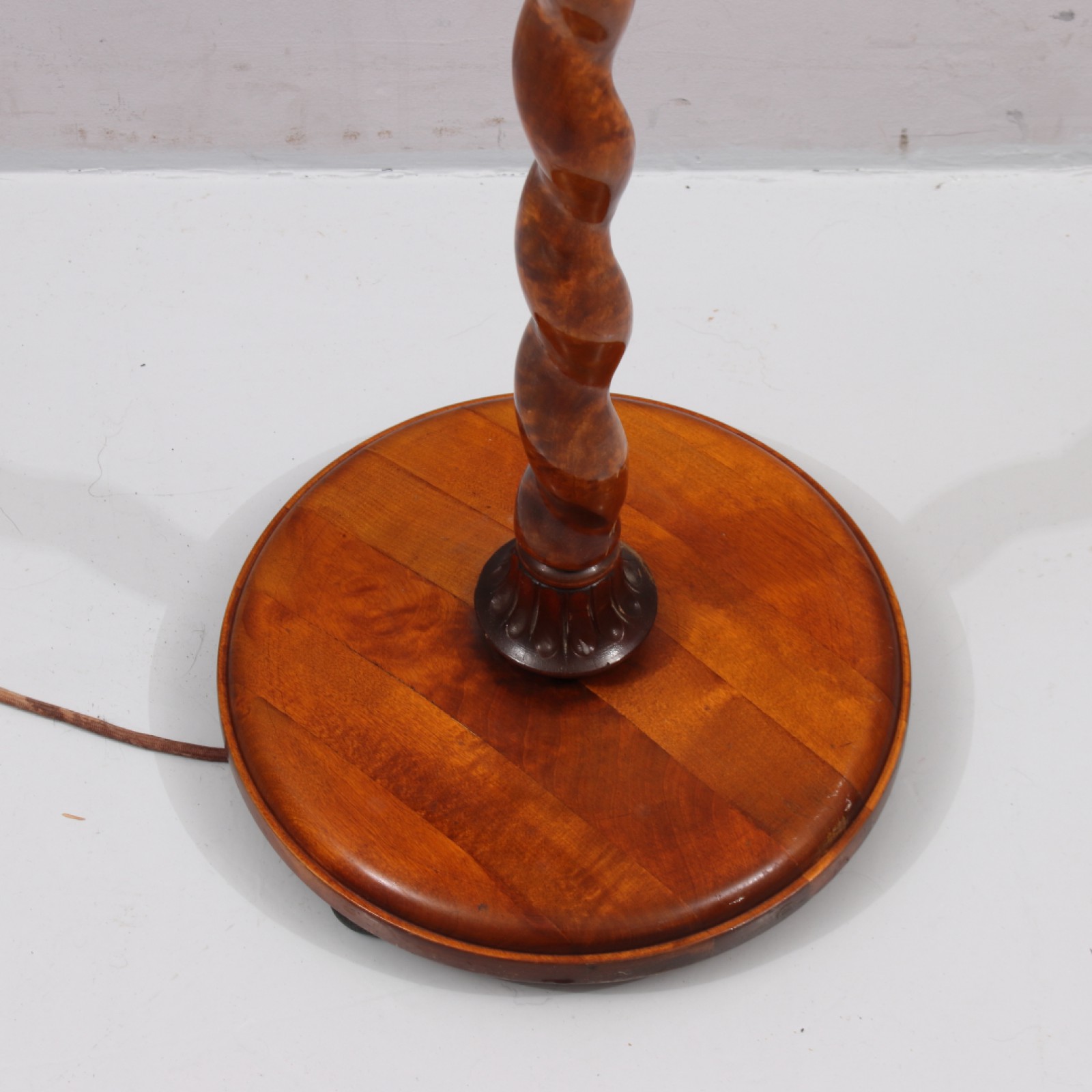 Fot i trä, tygklädd skärm, 1900-talets första hälft, senare skärm, OBS! knäckt lampsockel (se bilder. (vån2)