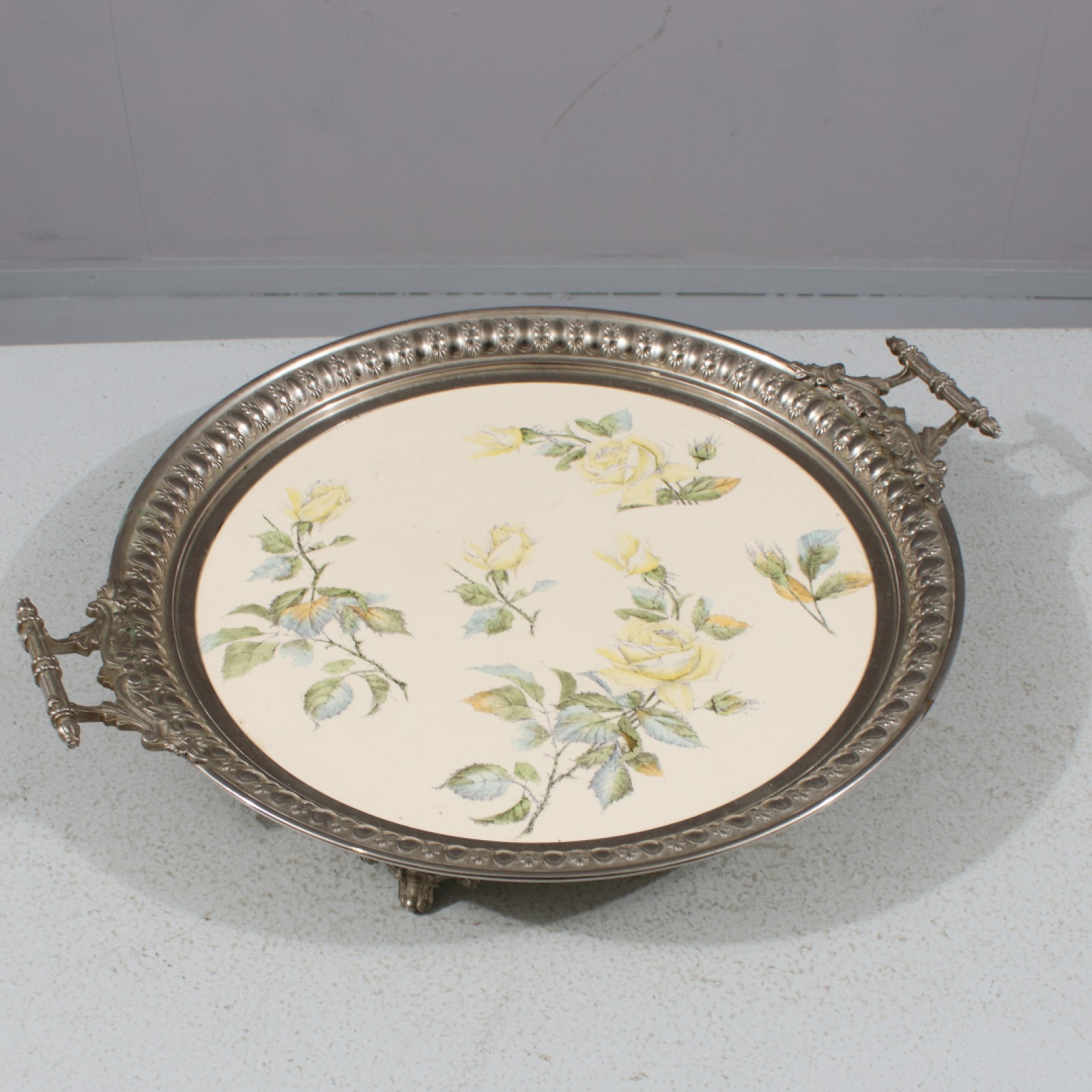 Metall och porslin, märkt Joh. Engström, Eskilstuna, Rörstrand, diameter 42 cm, bredd vid handtag 50 cm. (vån3)